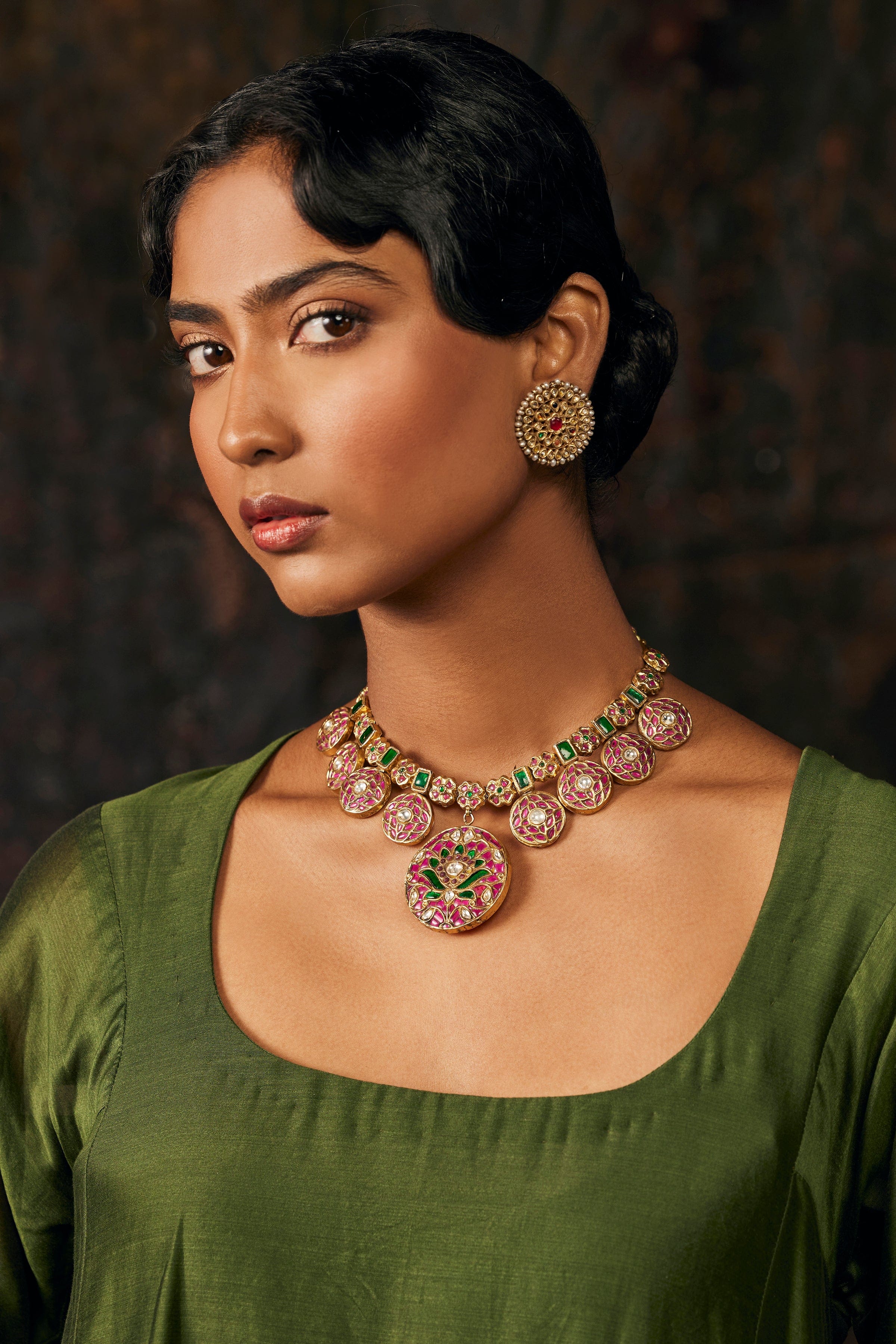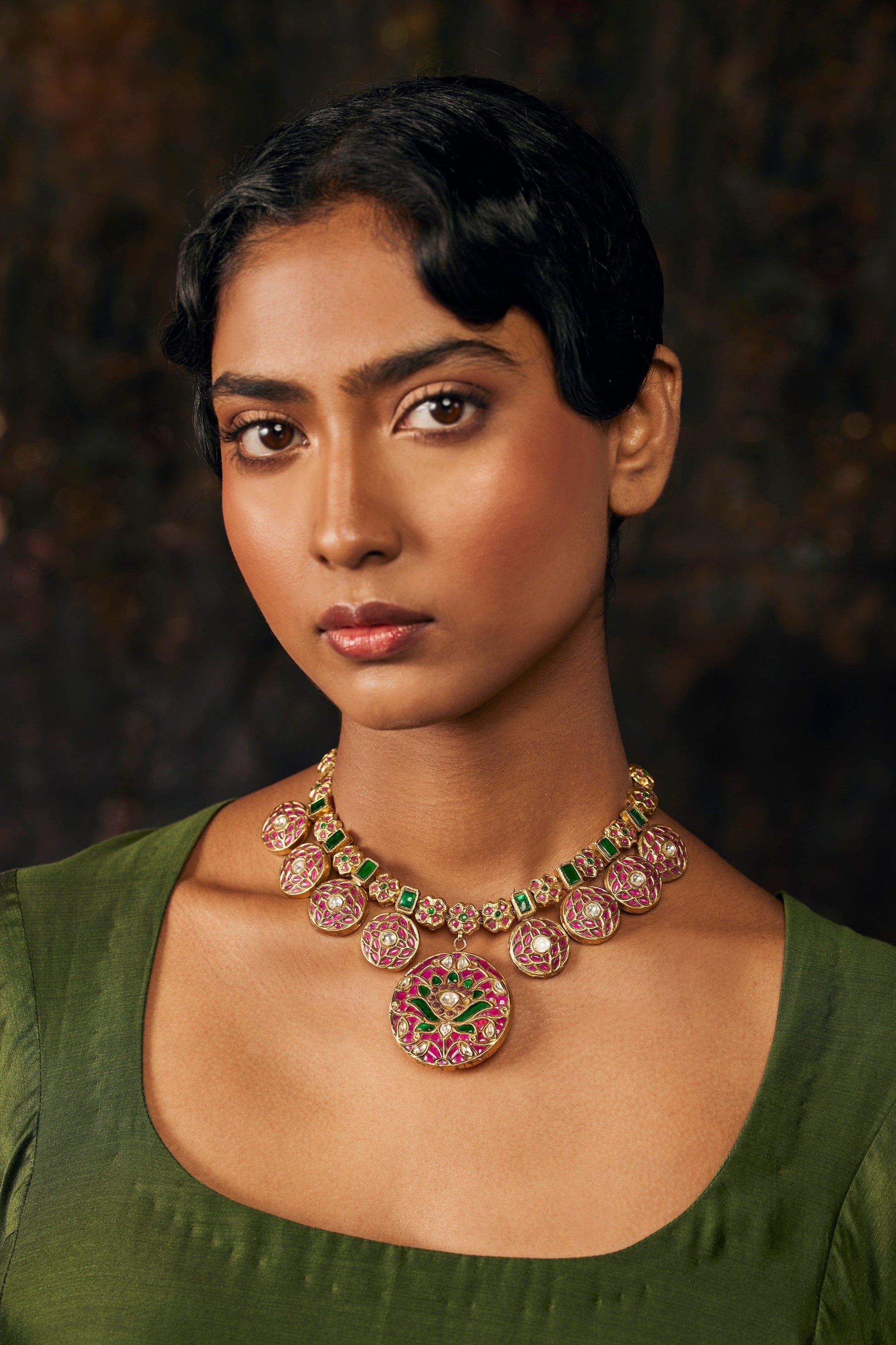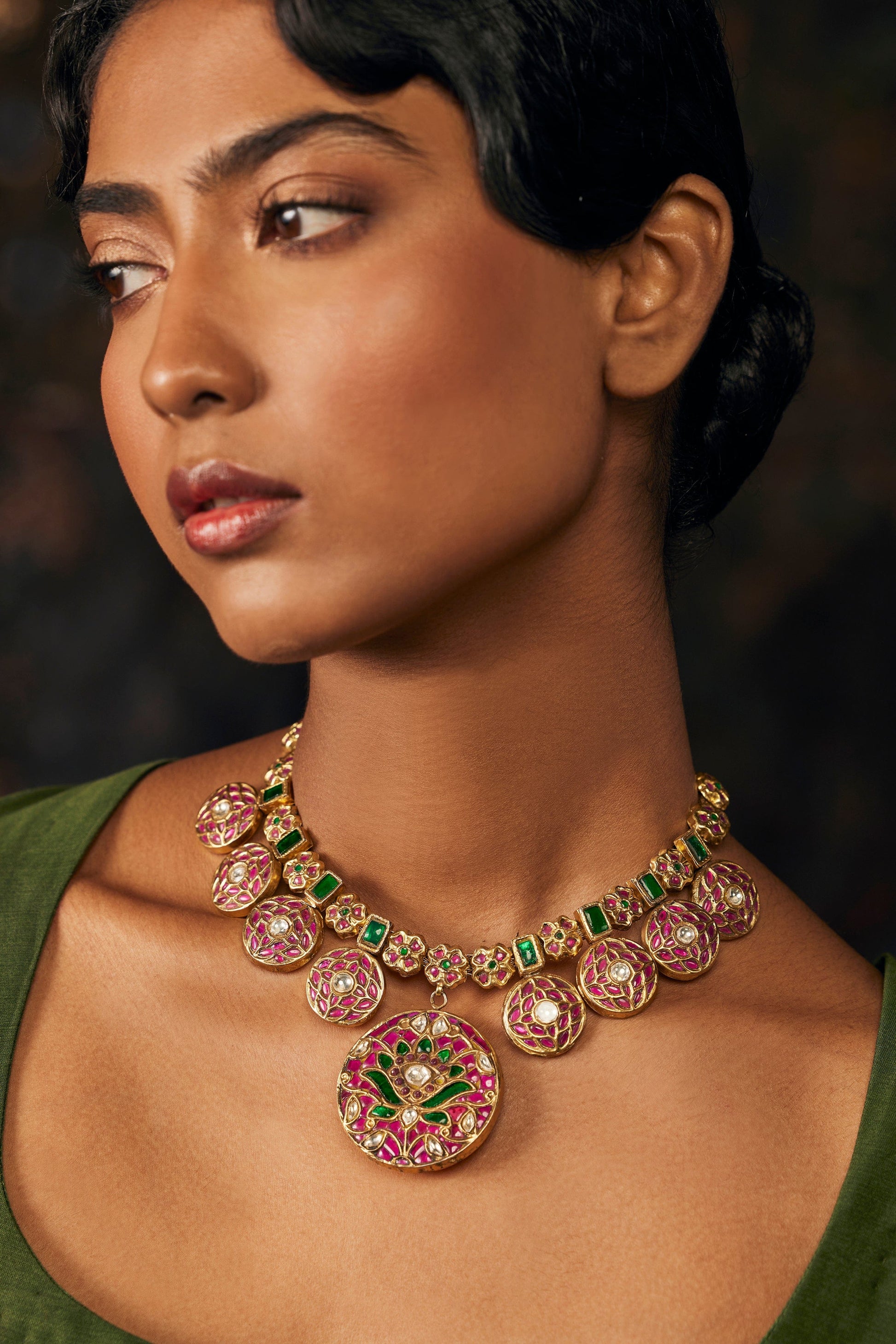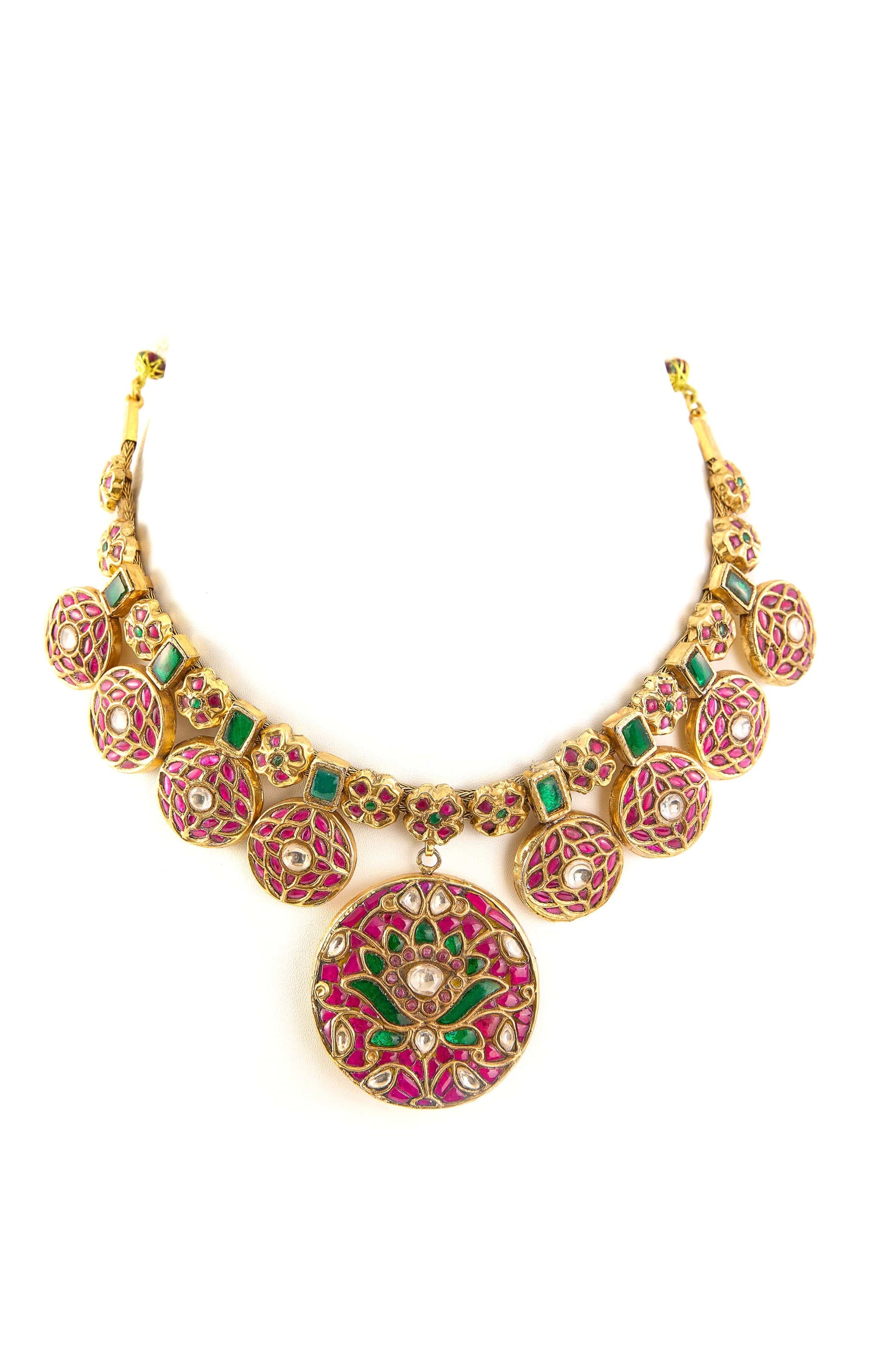 Jadau necklace in gold infused 92.5 silver with polkis, rubies, emeralds. Comes with a Comes with a traditional indian dori closure.