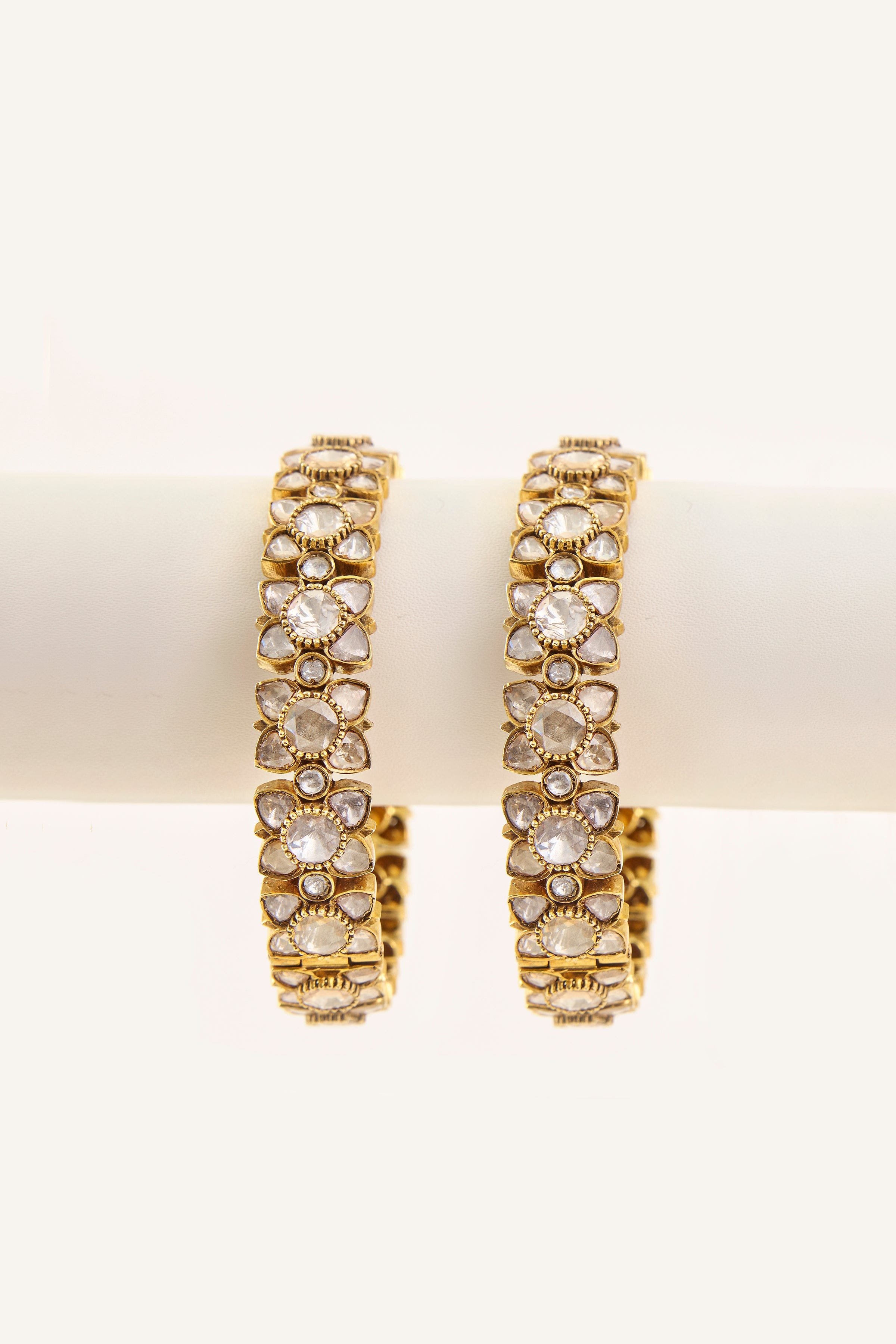 Polki flower kada in gold infused 92.5 silver with a lock and opening for easy wear.