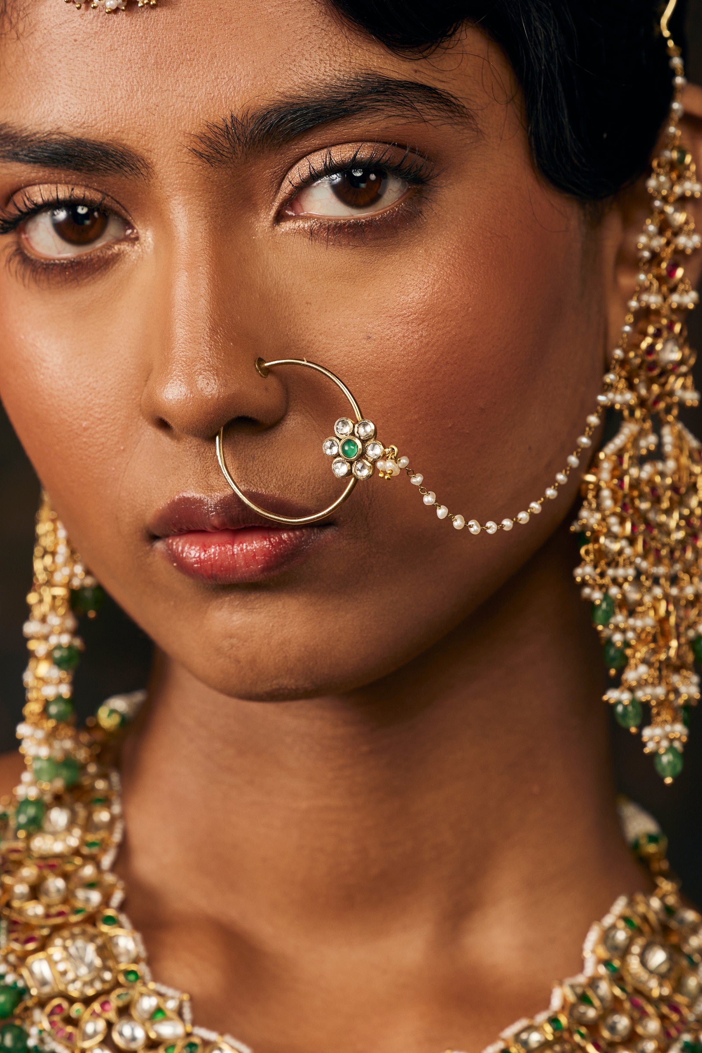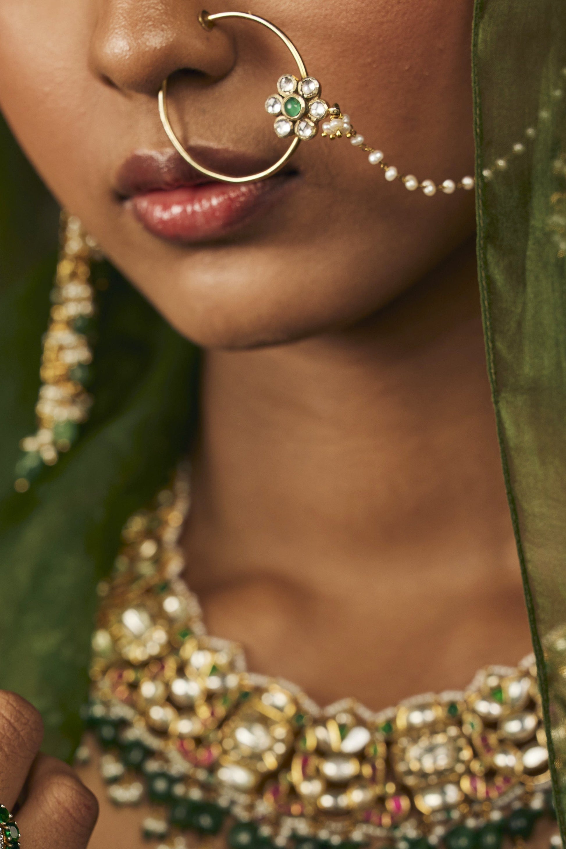 Polki and emerald flower nath in gold infused 92.5 silver with pearls.