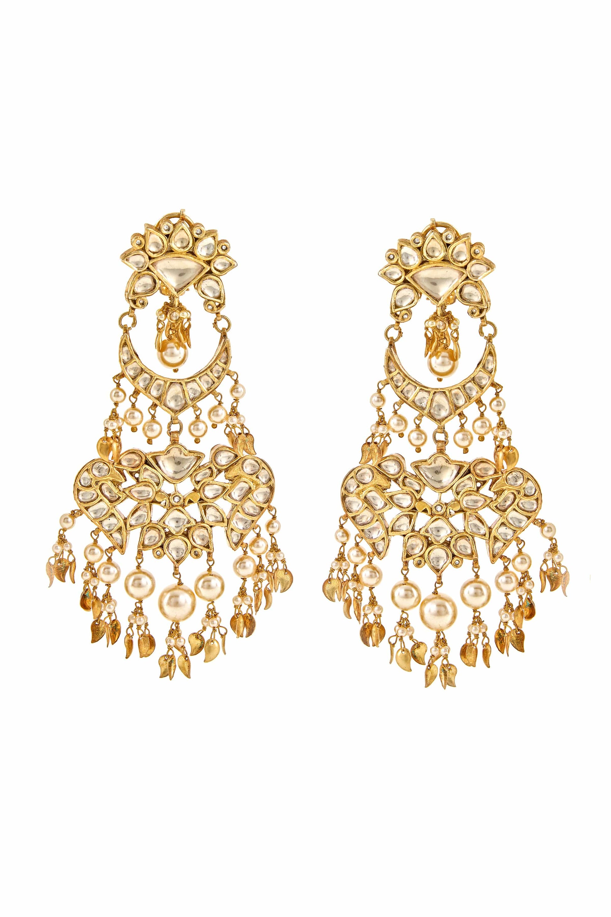 Punjab inspired long earrings in Polki with peepal Patti stringing in gold infused 92.5 silver alloy. Comes with a clip at back for extra support and push screw.