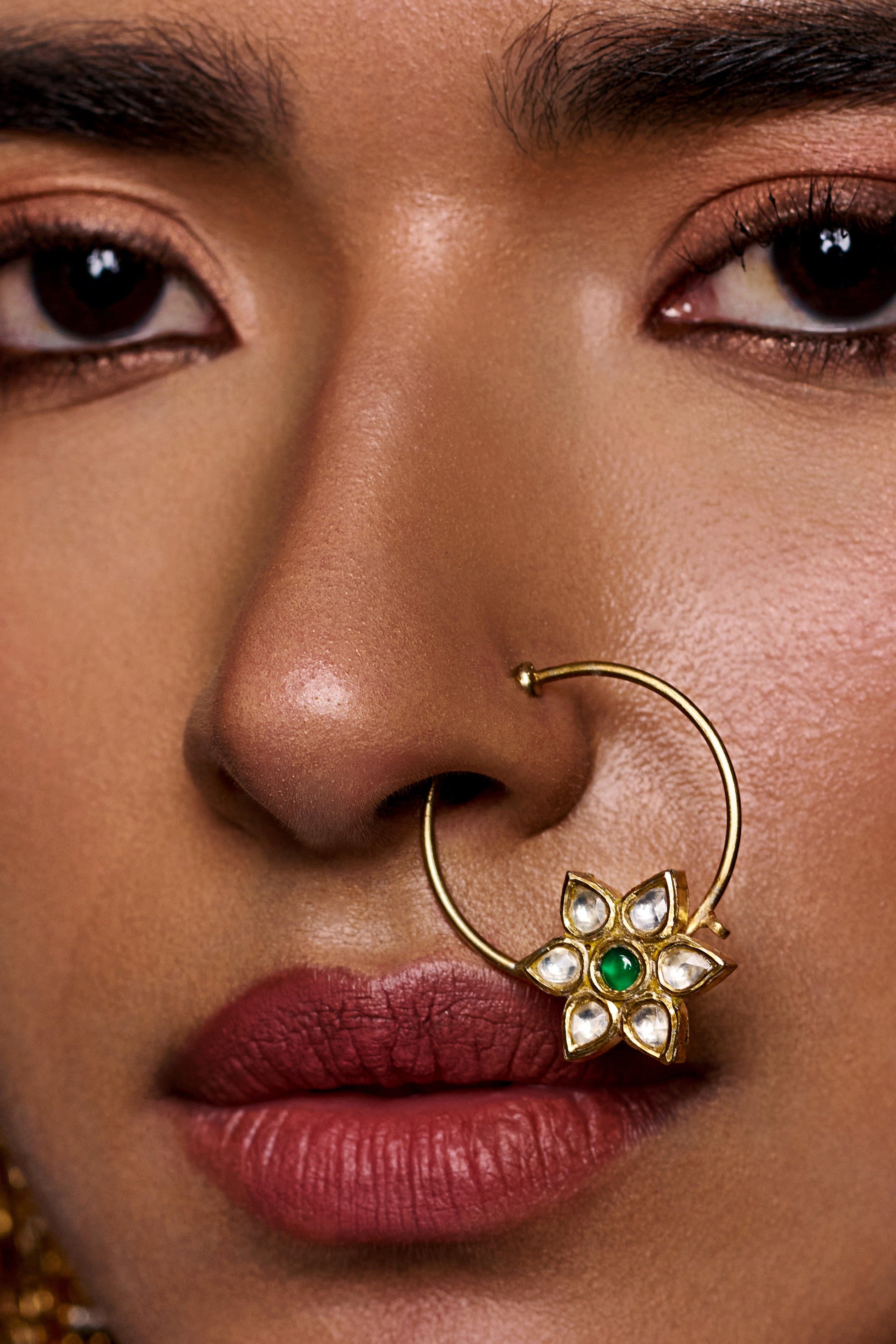 Flower shaped nose pin with six intricate leaf shaped polki diamonds