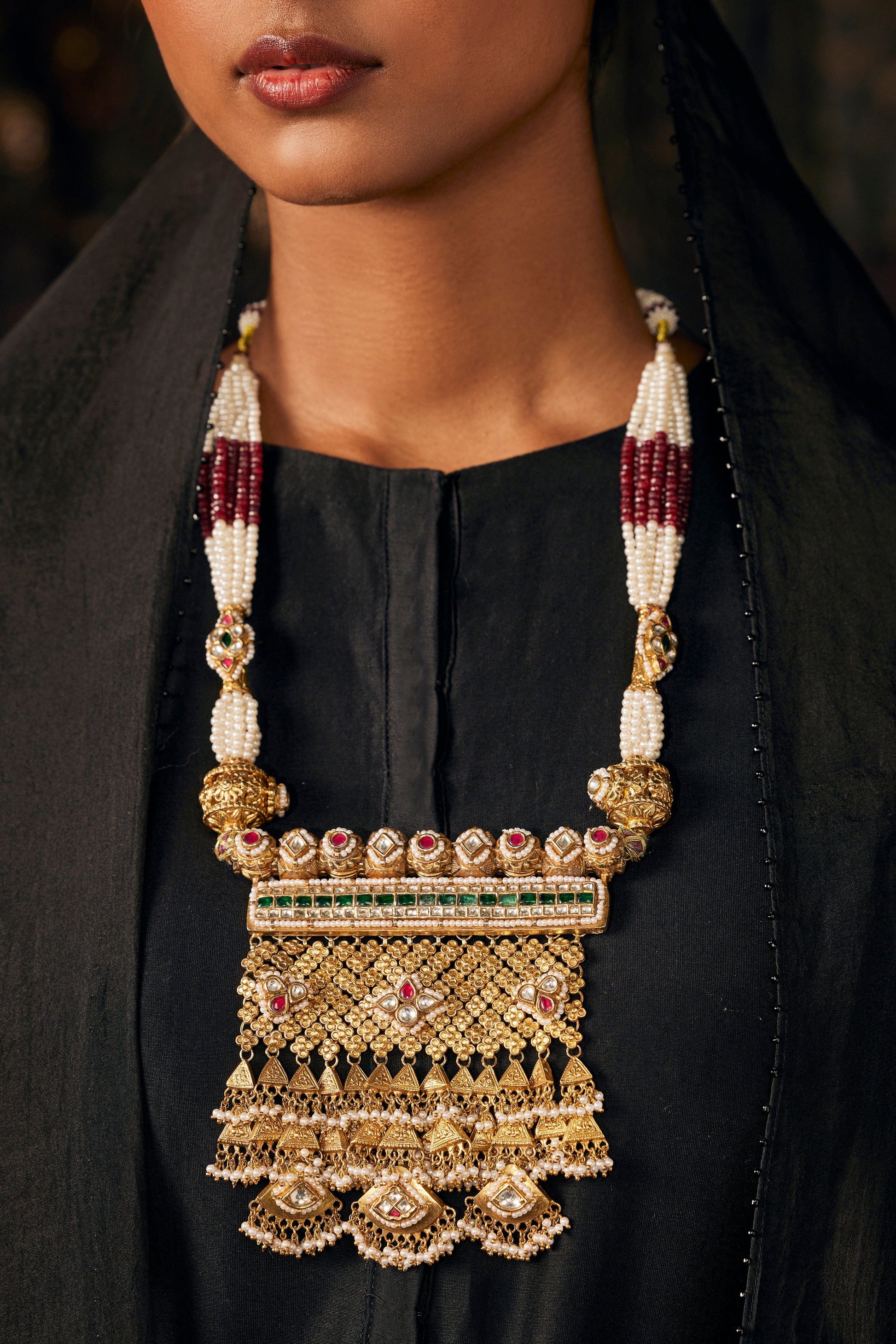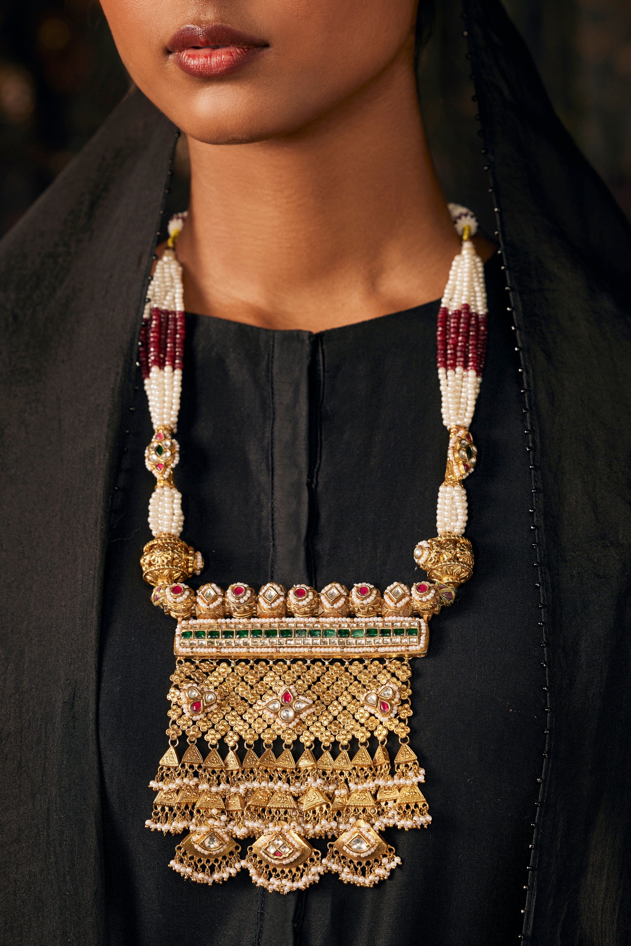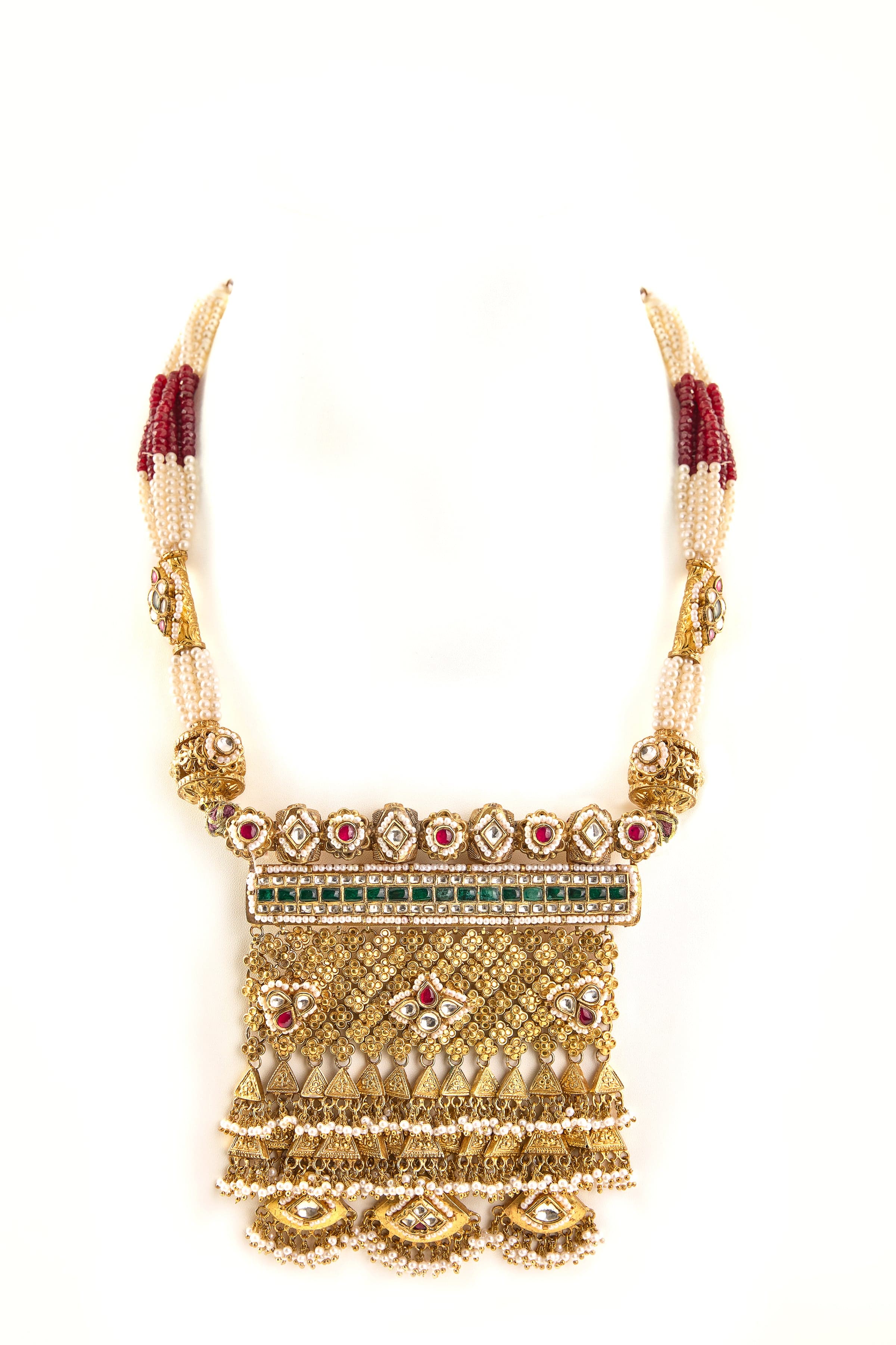 Rajasthani and necklace in gold infused 92.5 silver with rubies, emeralds and polki. Comes with traditional Indian dori closure.