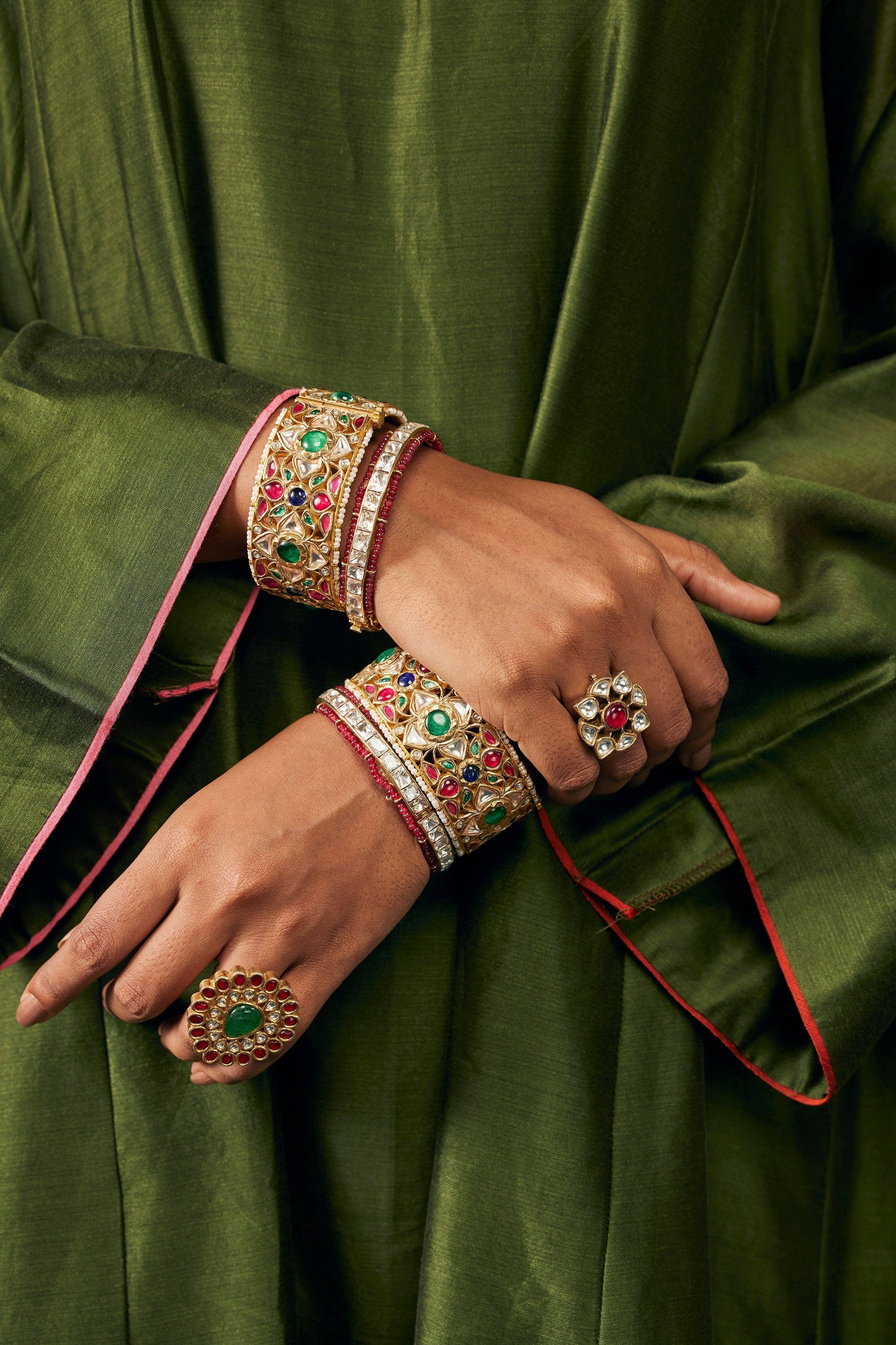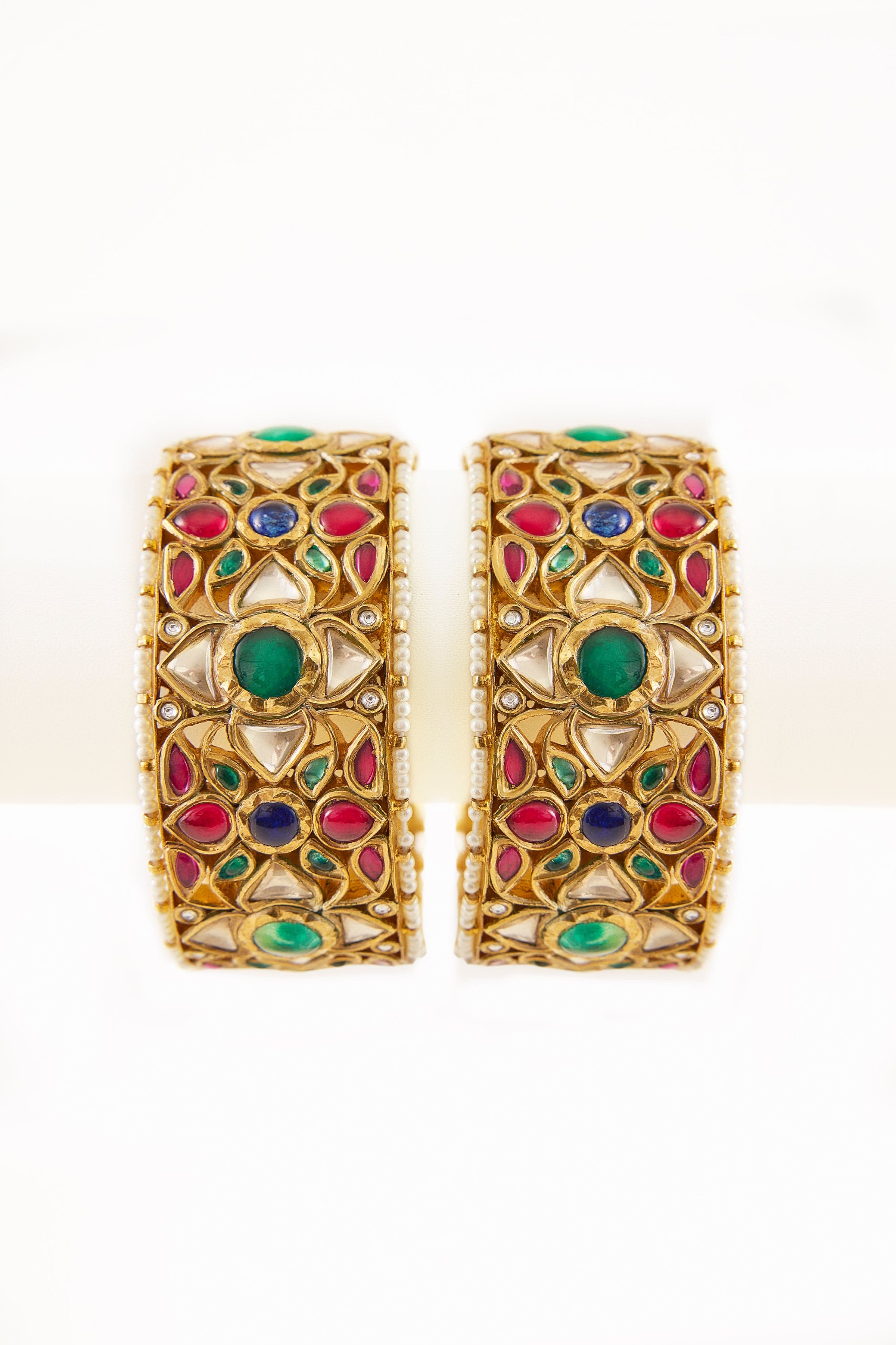 Mughal jadau kada in gold infused 92.5 silver with rubies, polki, emeralds and sapphires with an opening and lock for easy wear.