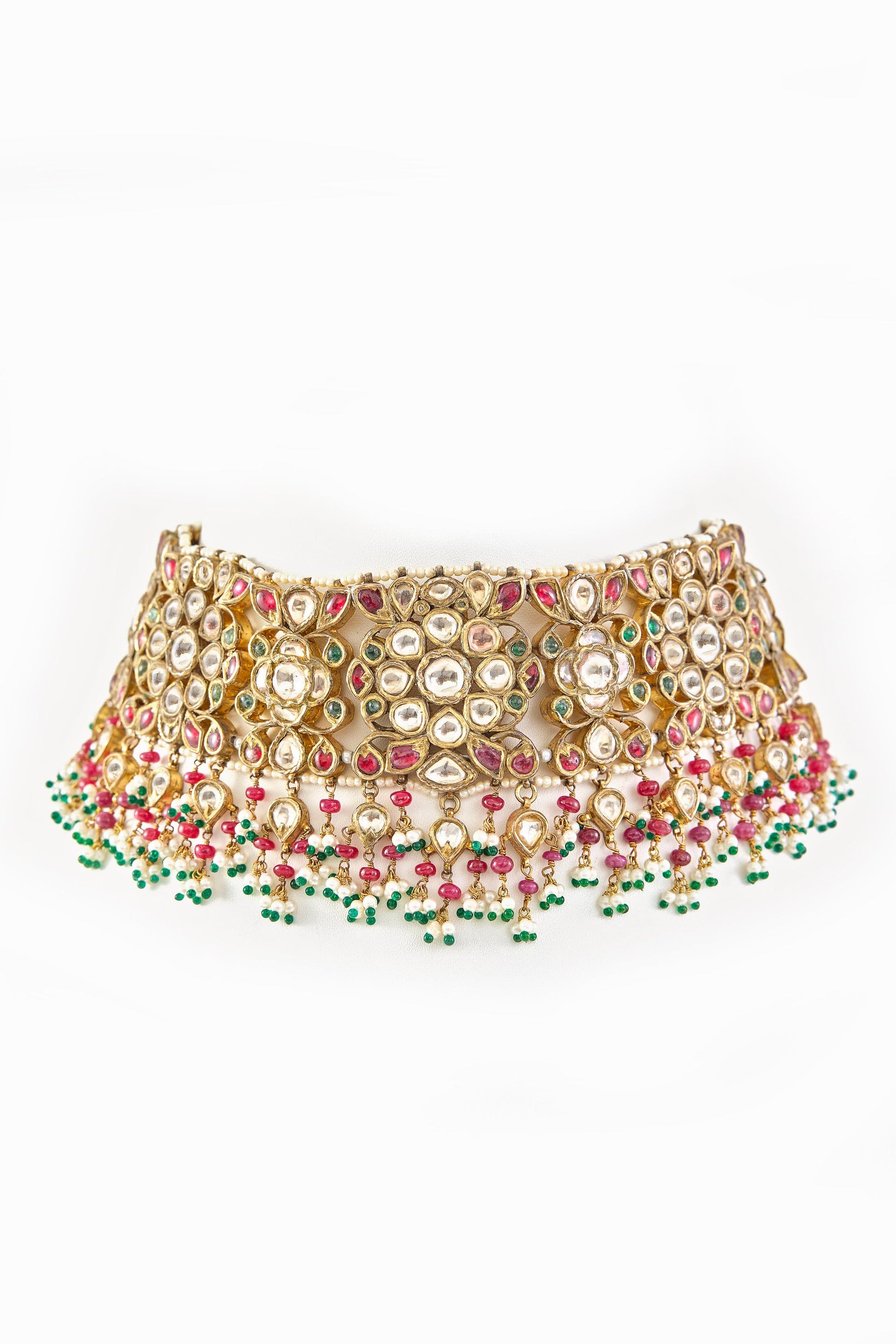 Jadau bridal choker in gold infused 92.5 silver with rubies, polki and stringing in emerald and moti. Comes with a traditional Indian dori closure.