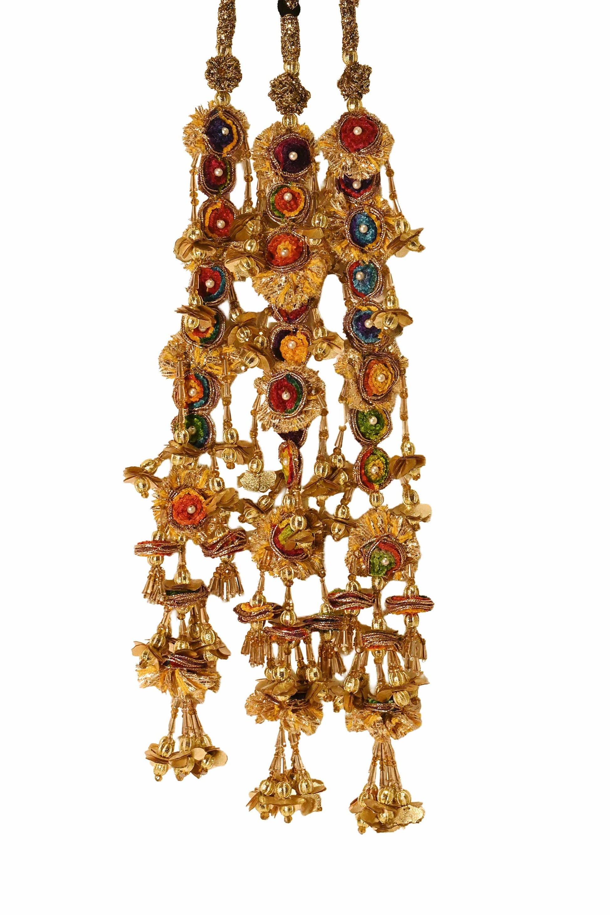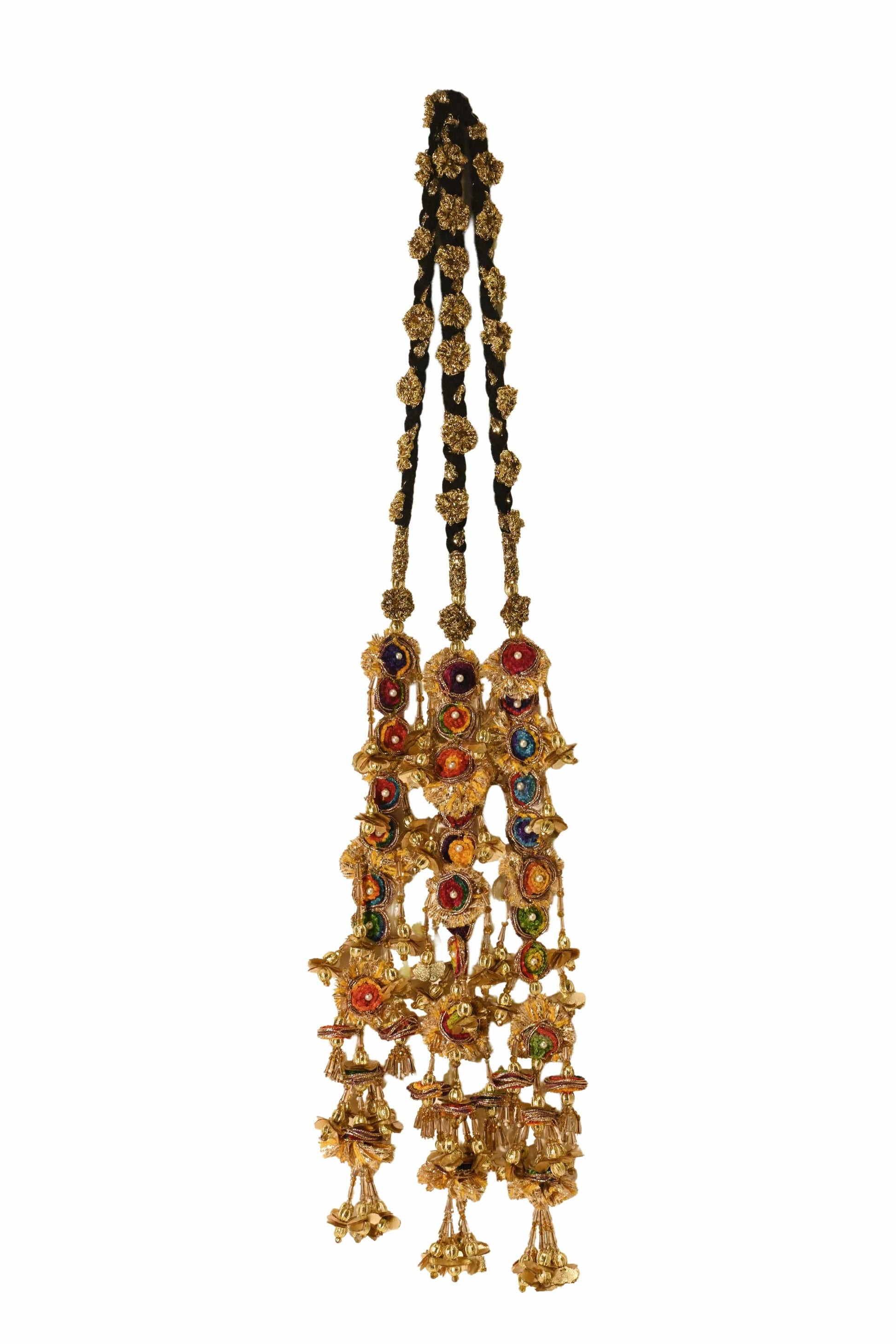 A multicolour handcrafted parandi adorned with gold gota balls, coloured crystal accents, pearls, and lace-wrapped braids, finished with layered tassels.