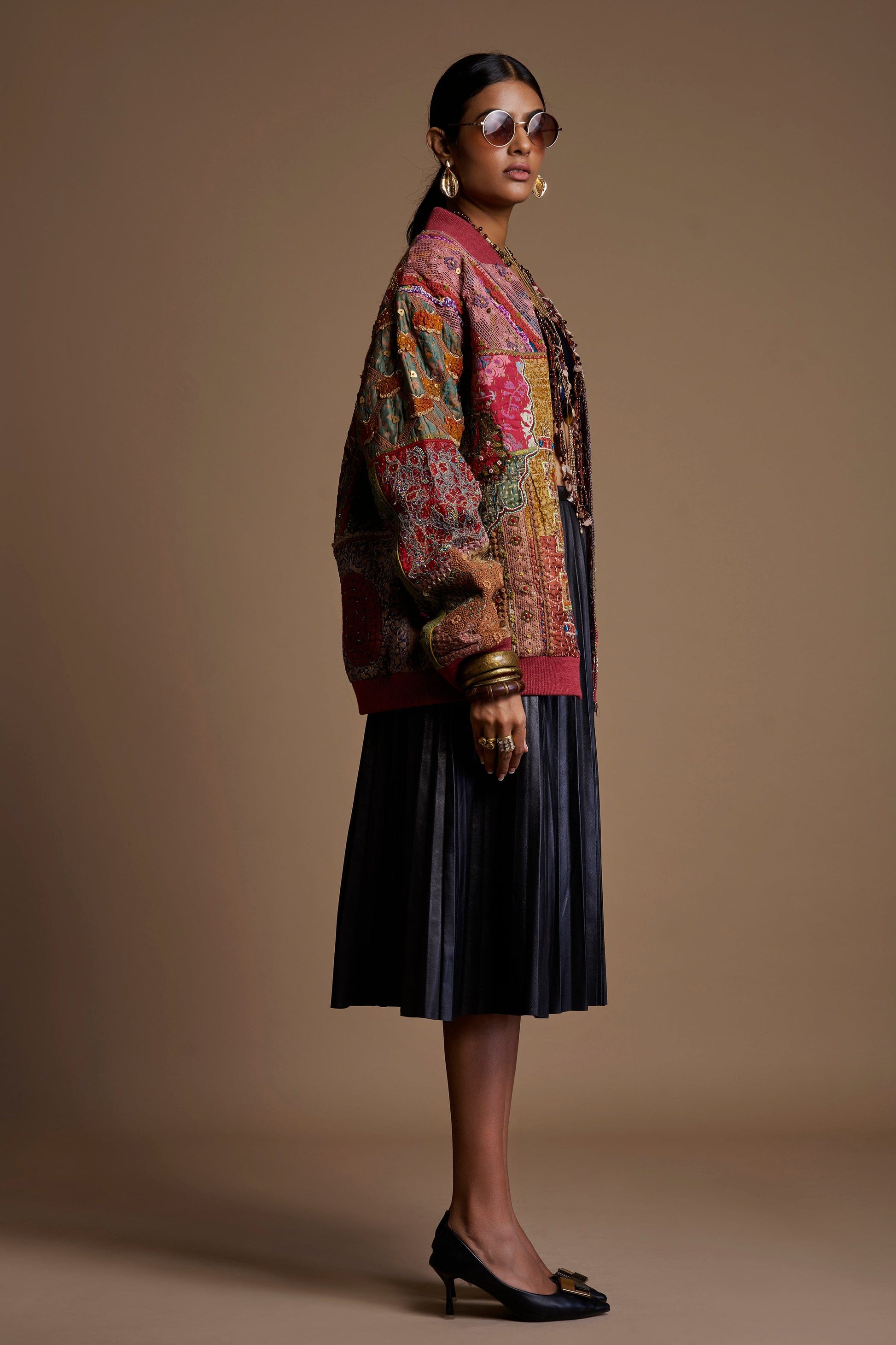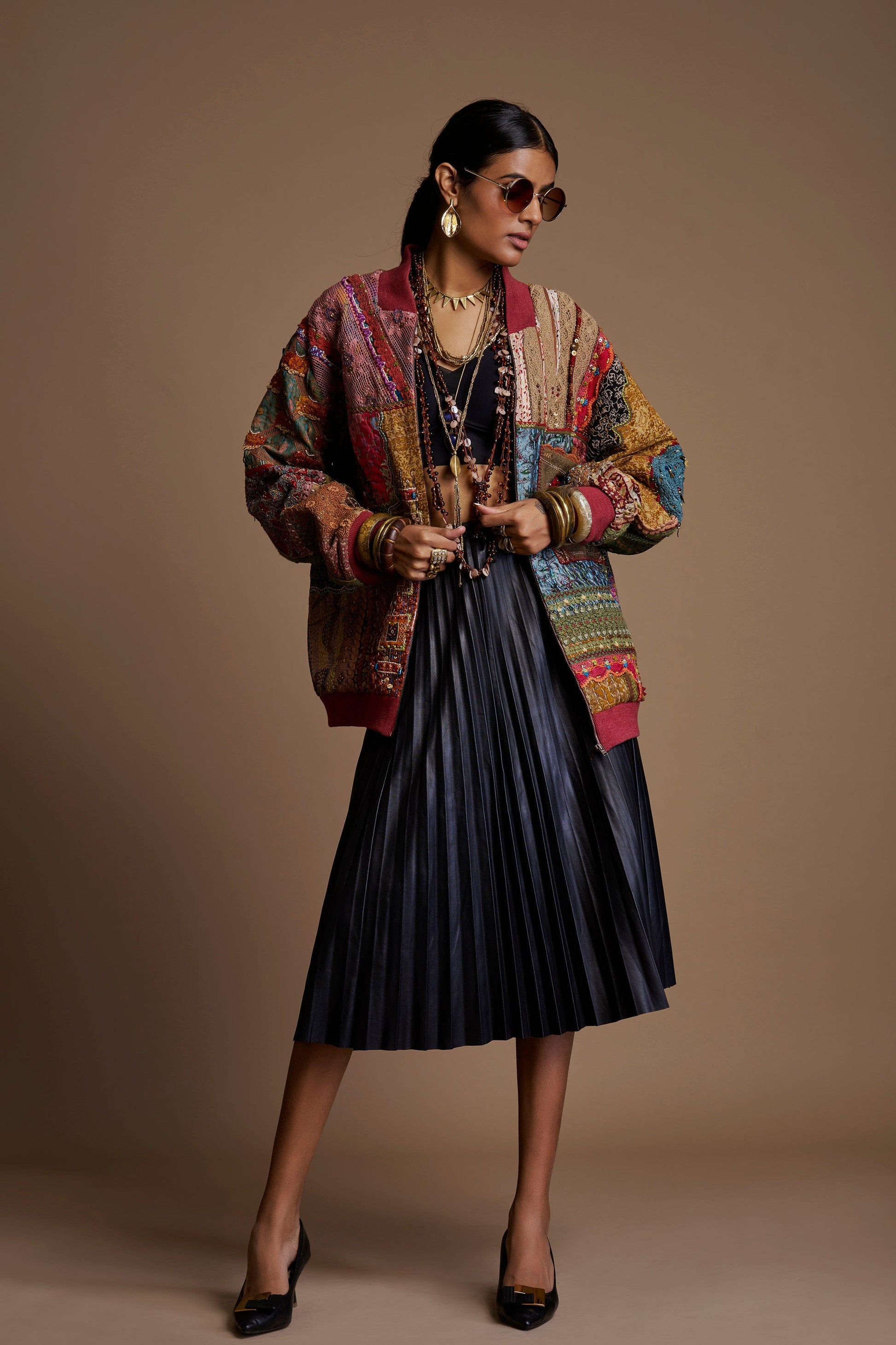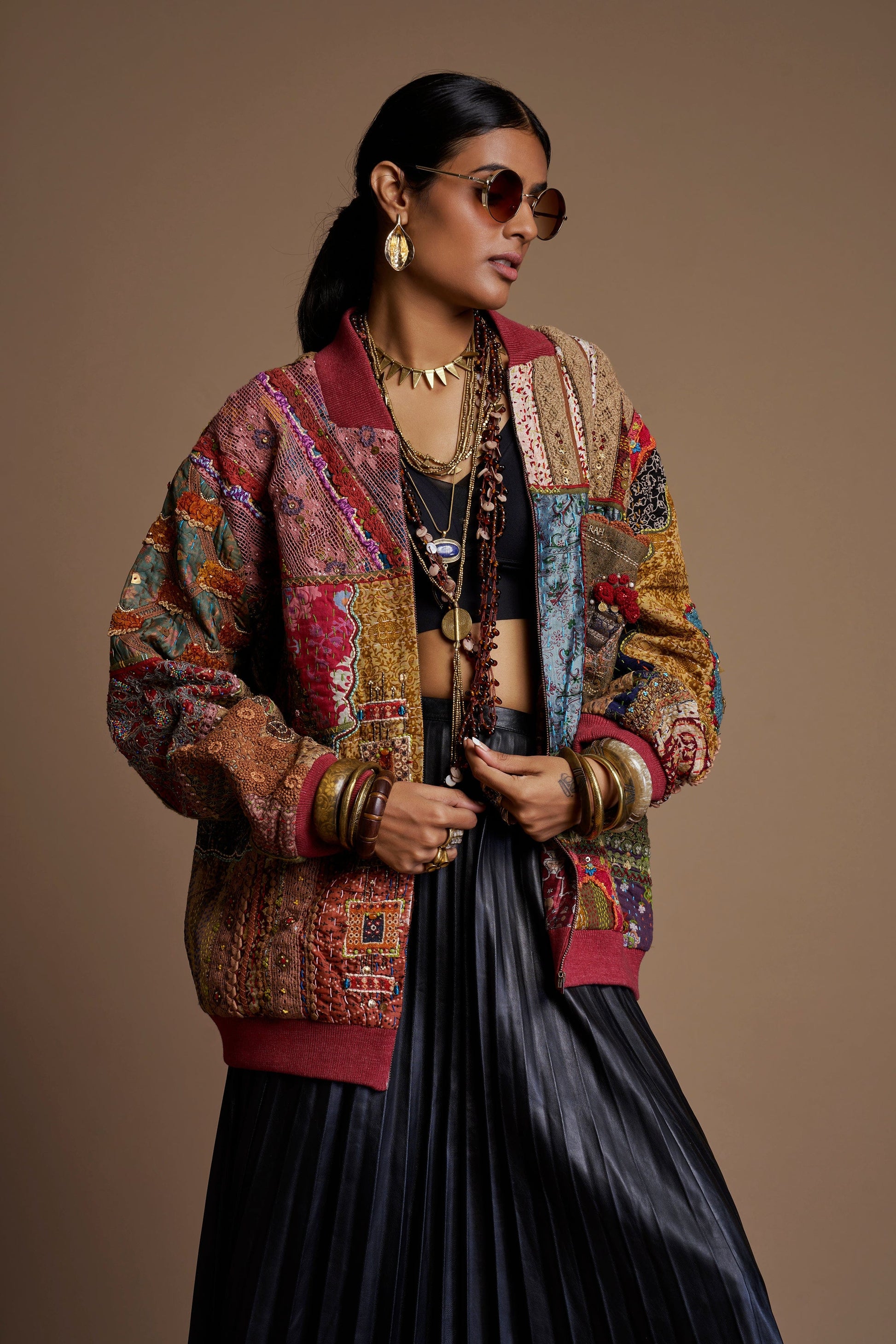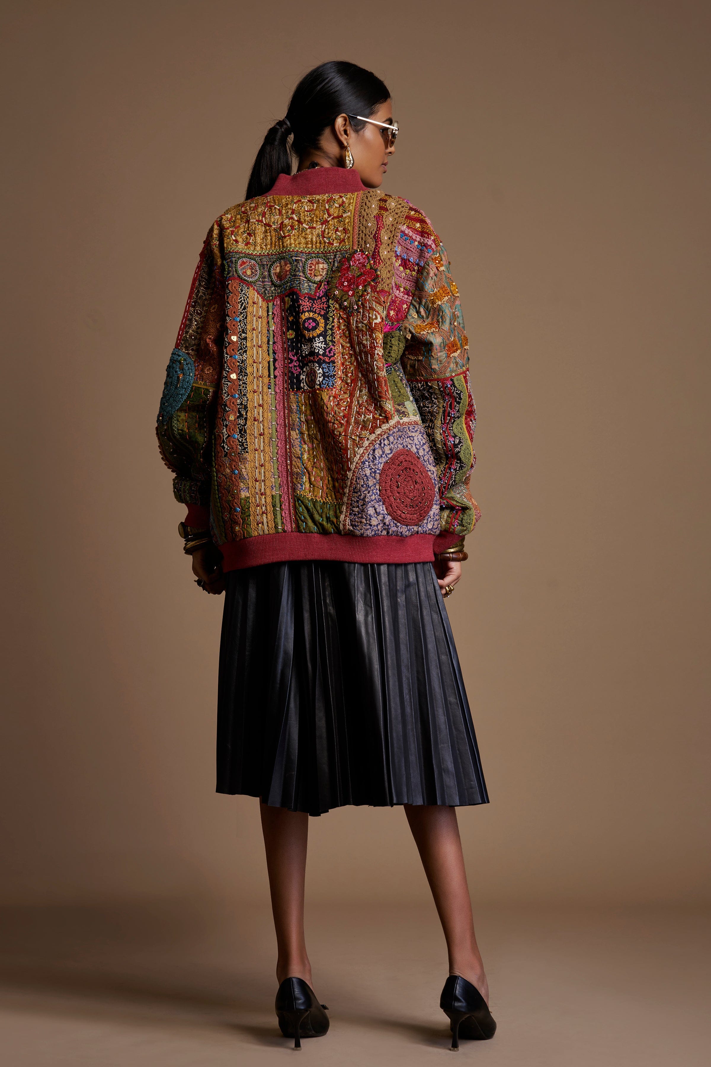 A one-of-a-kind jacket crafted from upcycled Kantha pieces, enriched with intricate handwork, textured patching, and vibrant detailing. A truly sustainable statement piece celebrating heritage craft and artistic individuality.