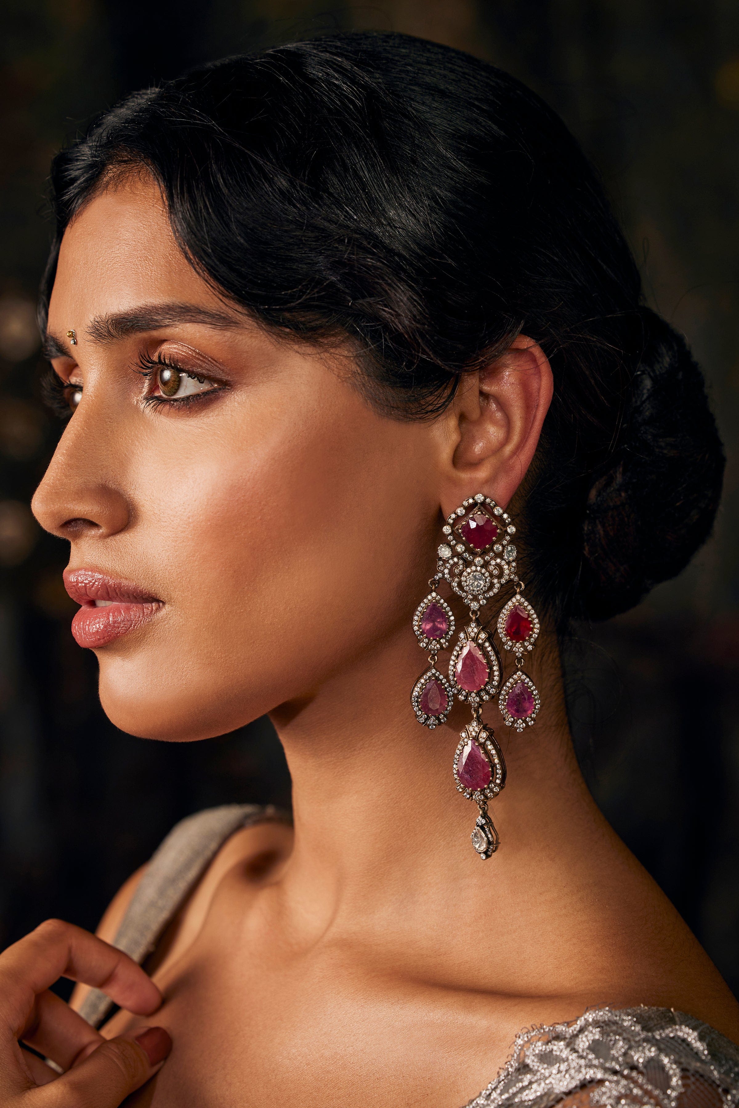Victorian earrings in gold infused 92.5 silver with rubies and zircons. Comes with a clip at back for extra support and push screw.