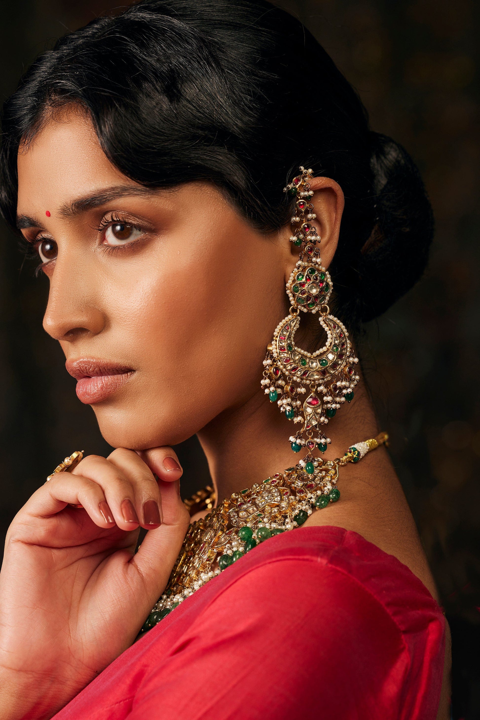 Traditional Mughal inspired jadau chaand balis in gold infused 92.5 silver with polkis, rubies, emeralds and stringing of moti and aventurines. Comes with a clip at the back and an attached ear chain for extra support and push screw.
