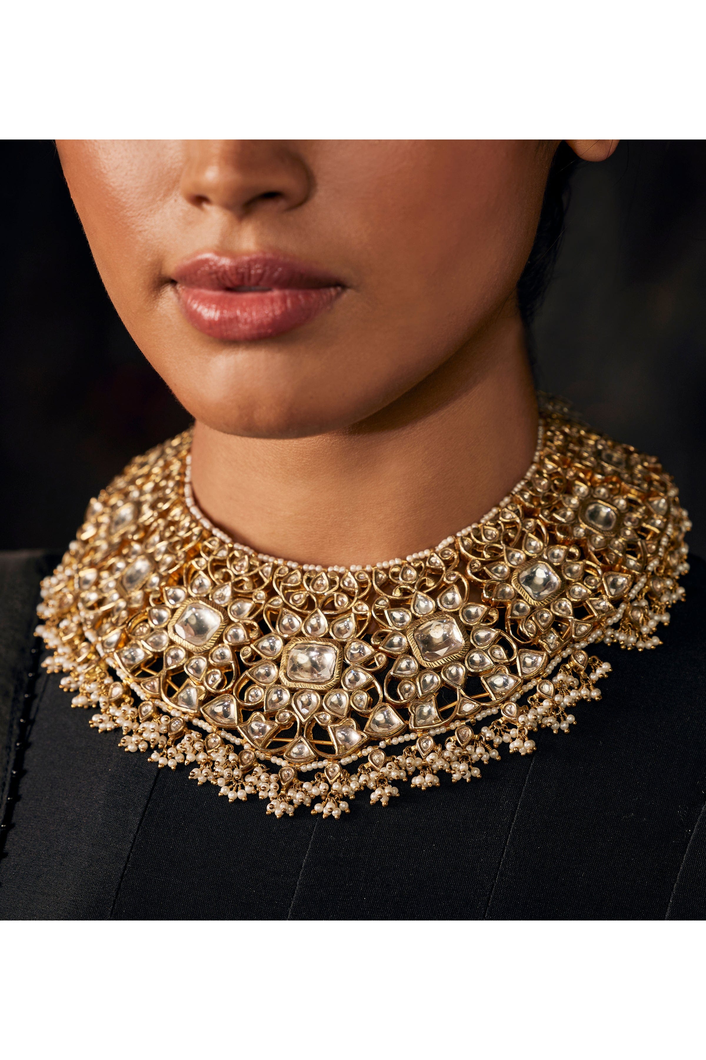 Jadau Gulband in gold infused 92.5 silver with polkis and stringing of moti. Comes with a traditional indian dori closure.