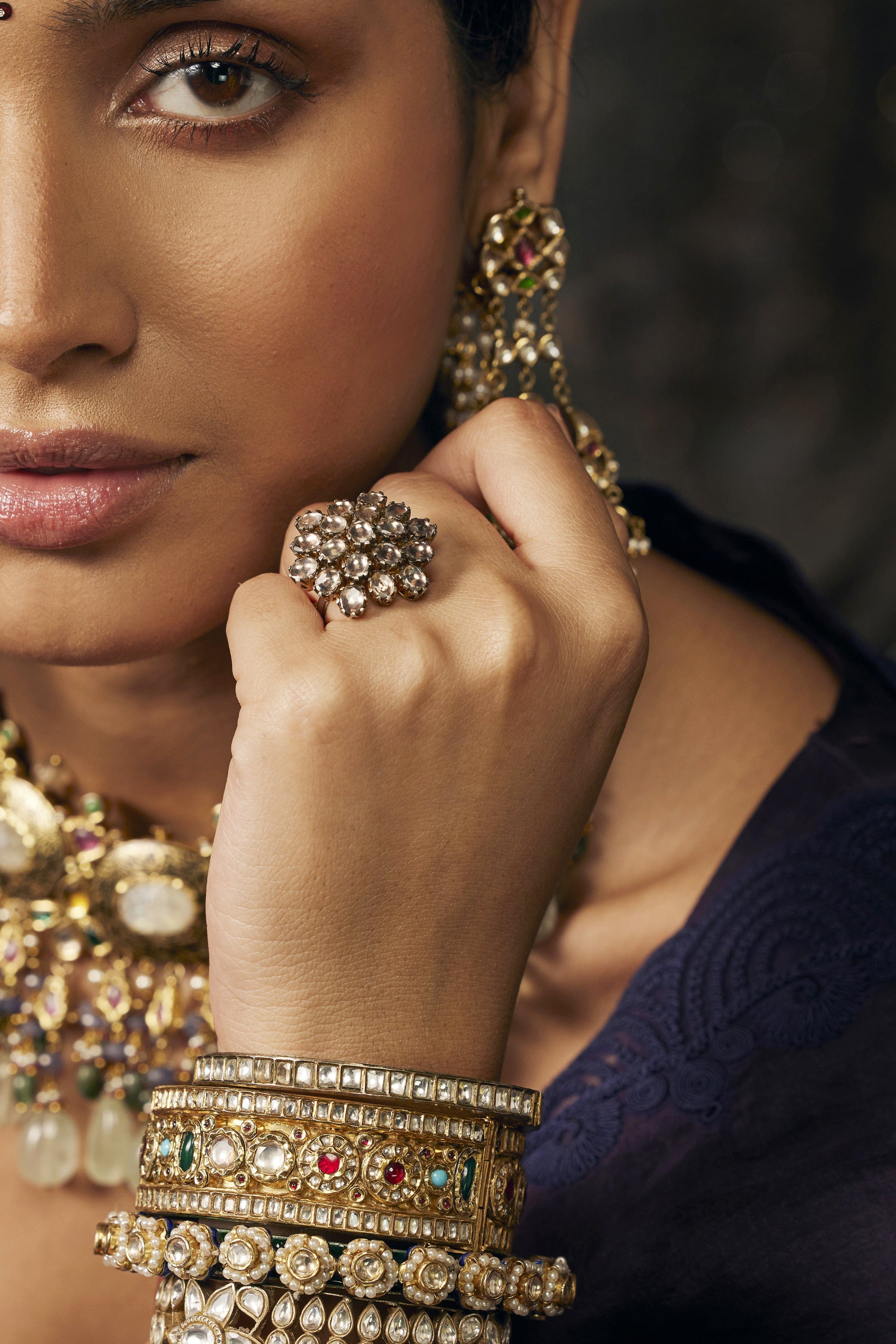 Ring with polki in gold infused 92.5 silver. comes with an adjustable band.