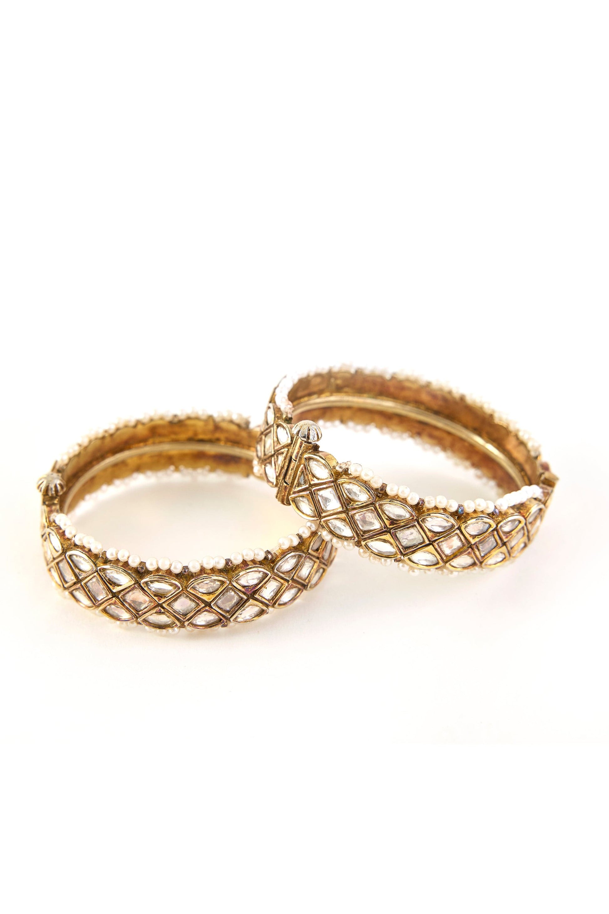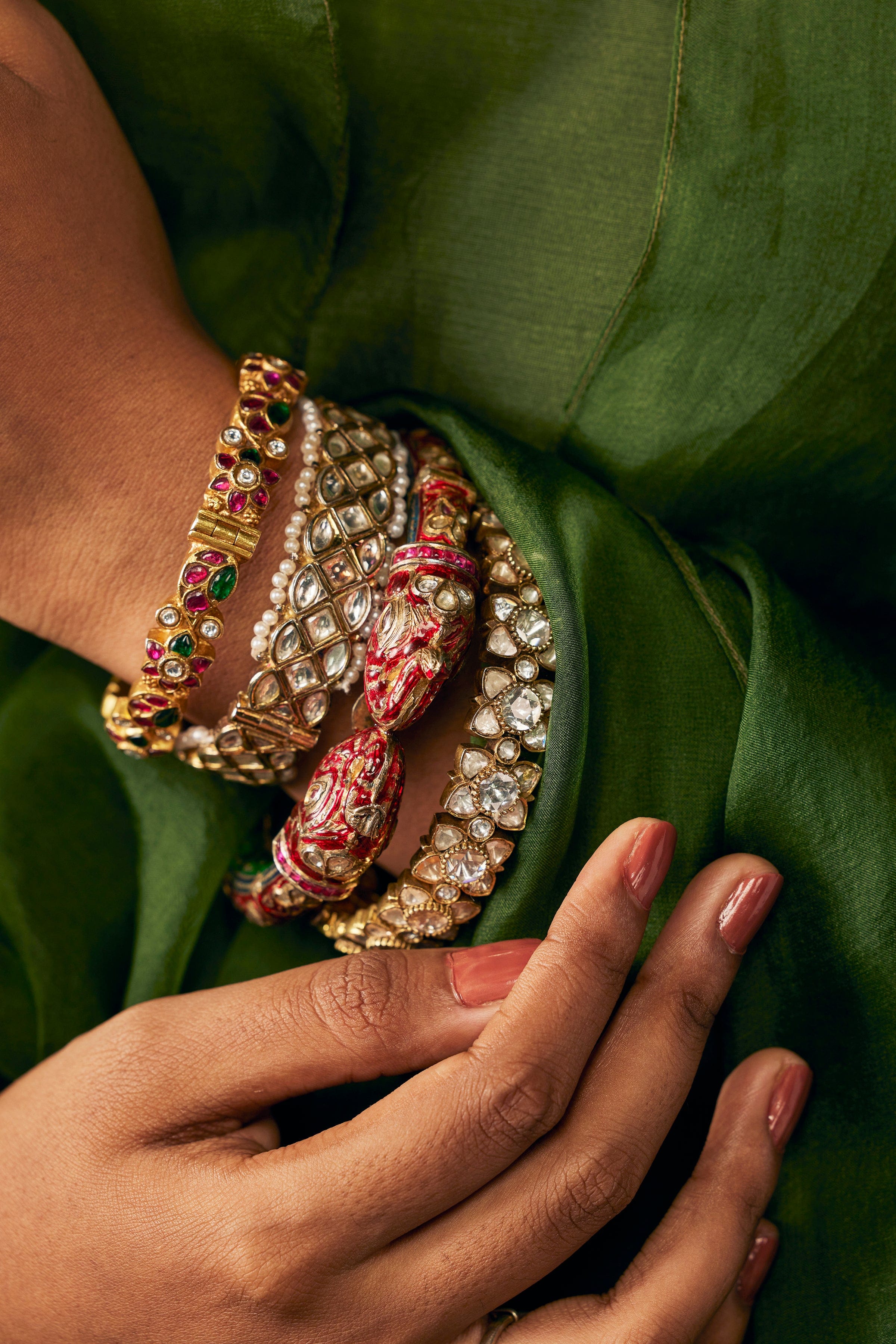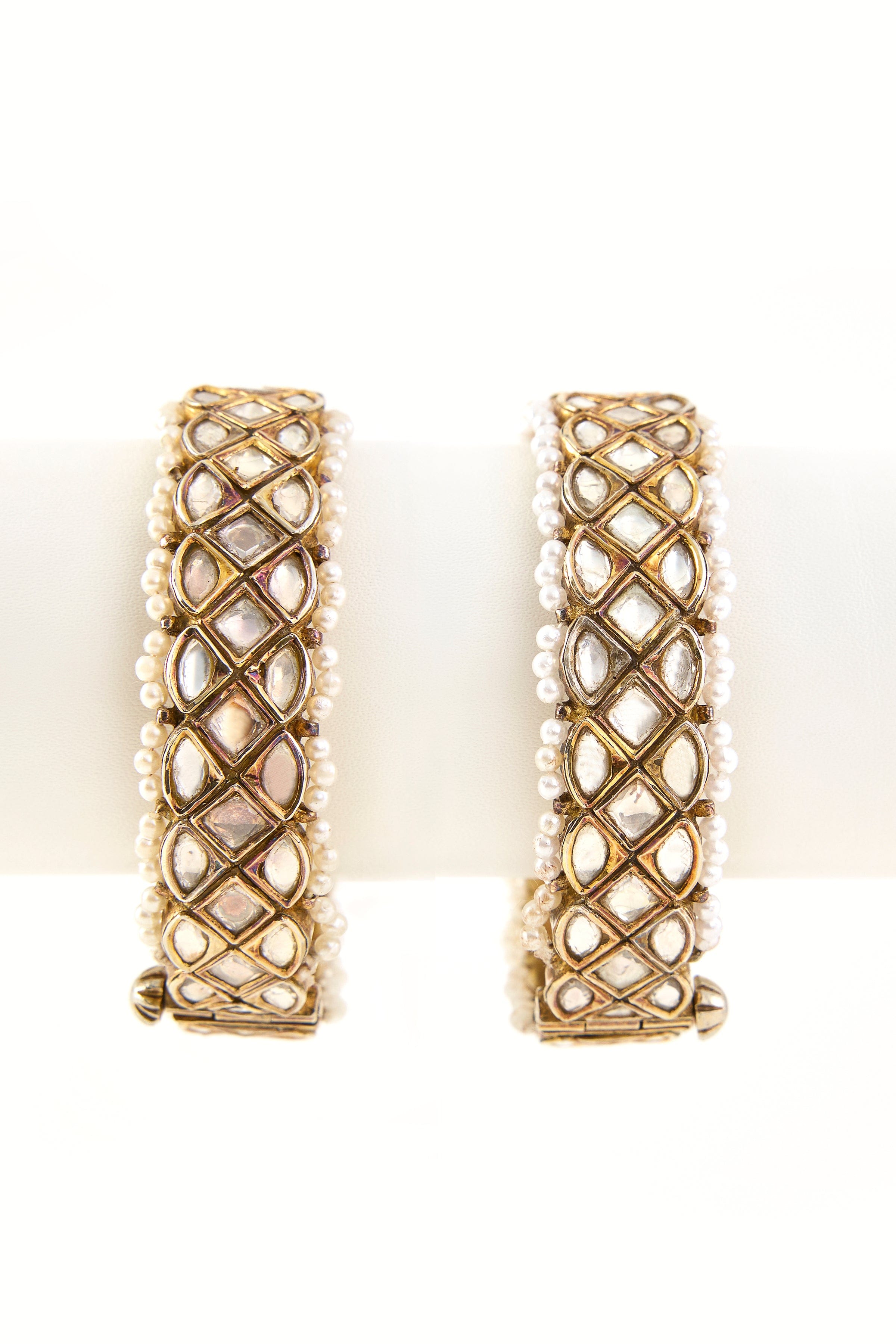 Polki and moti kada in gold infused 92.5 silver with a lock and opening for easy wear.
