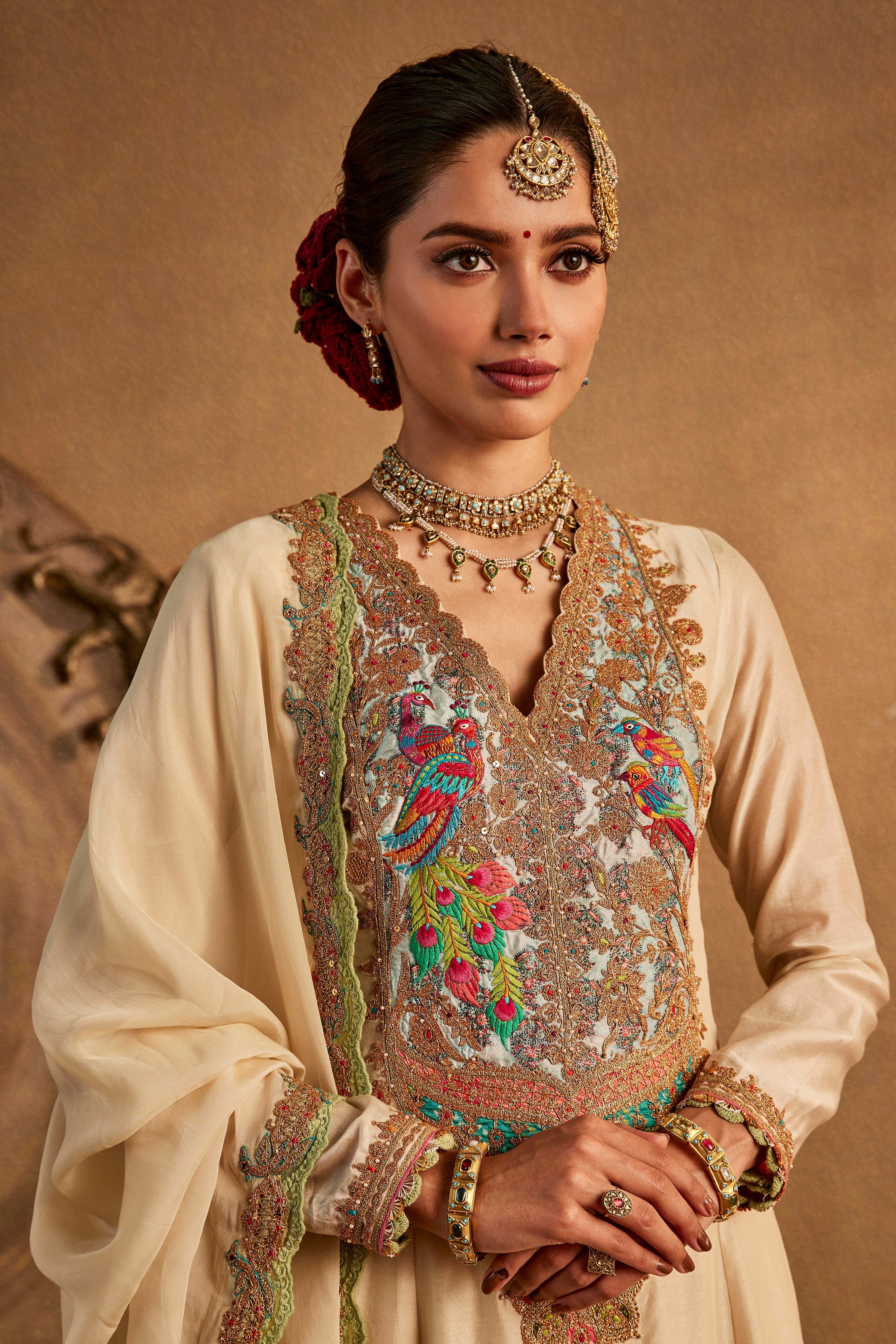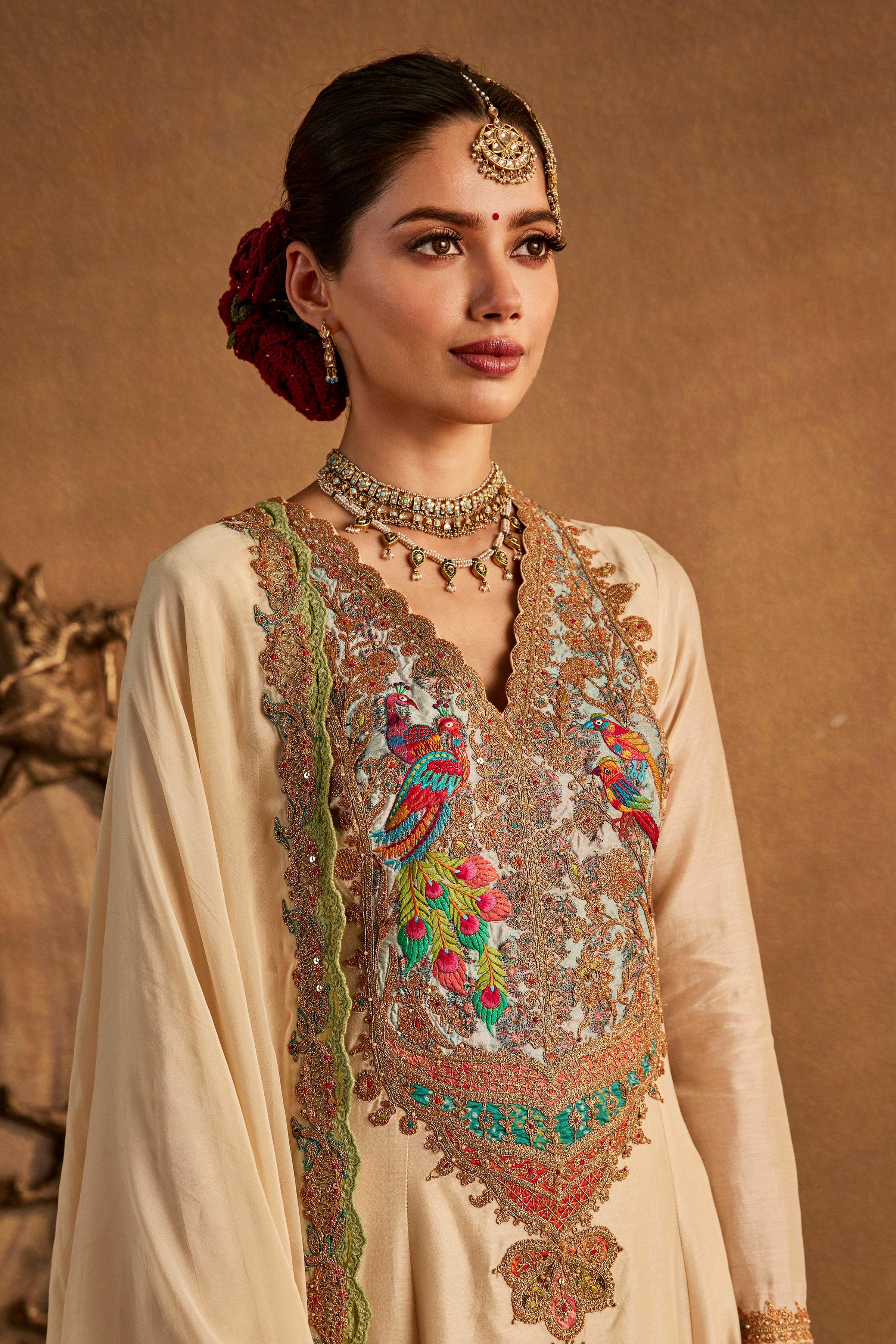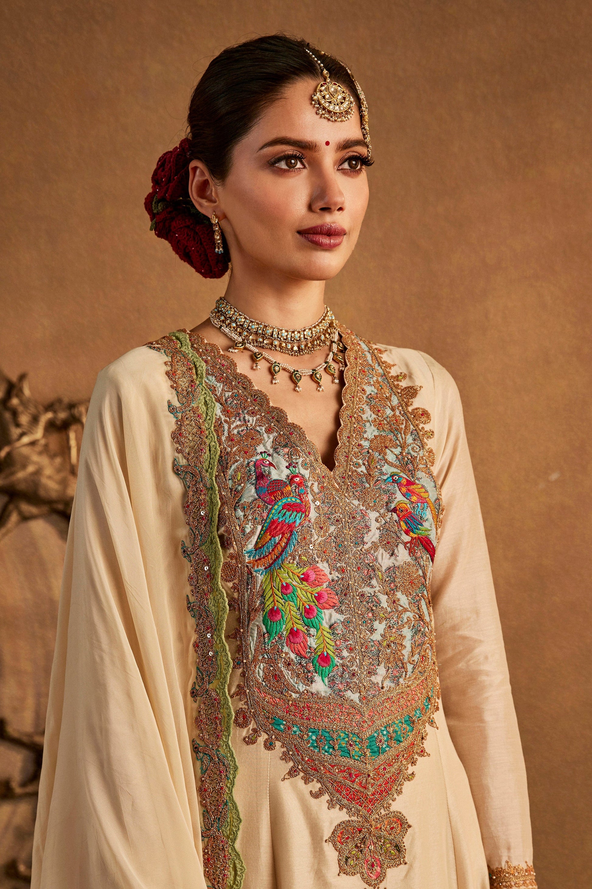 A soft ivory silk kurta paired with pants. The kurta features classic avian and sacred geometry motifs crafted with marodi ka kaam. The look is completed with a sheer organza dupatta.