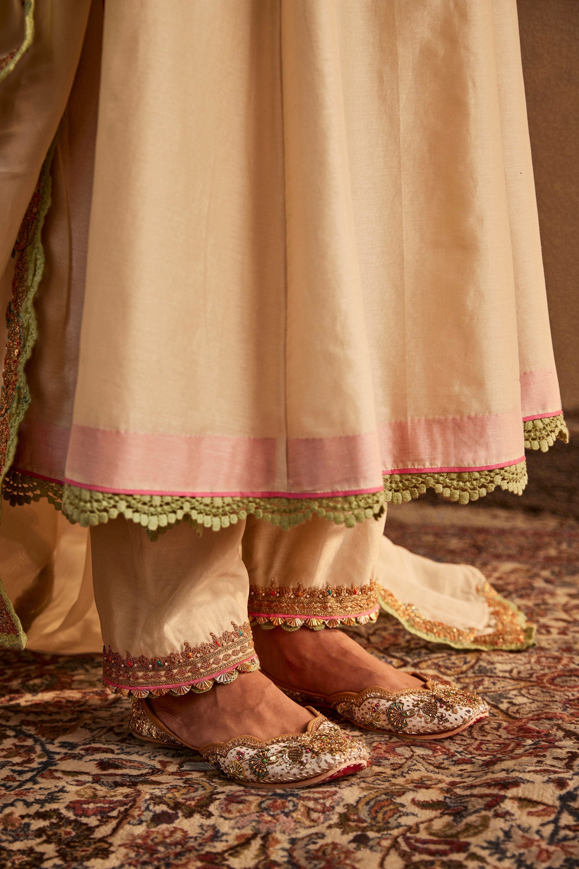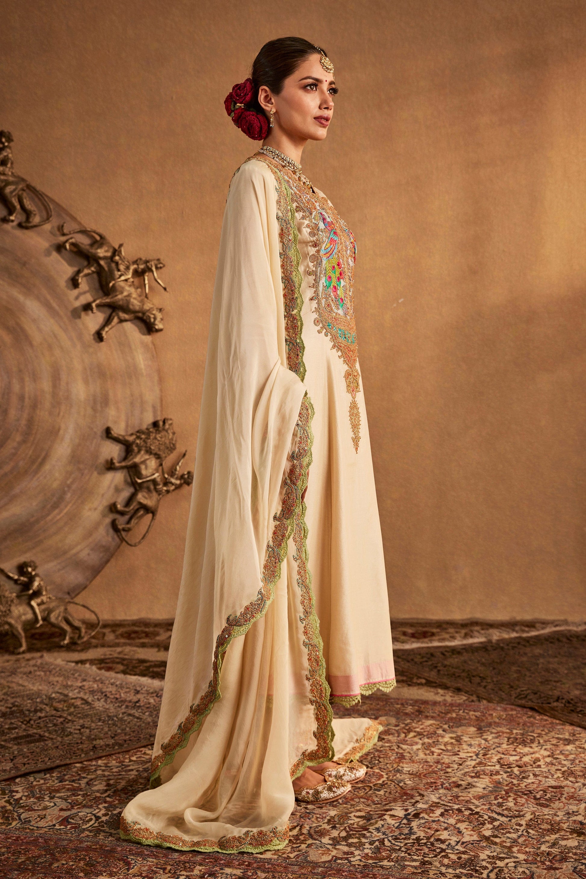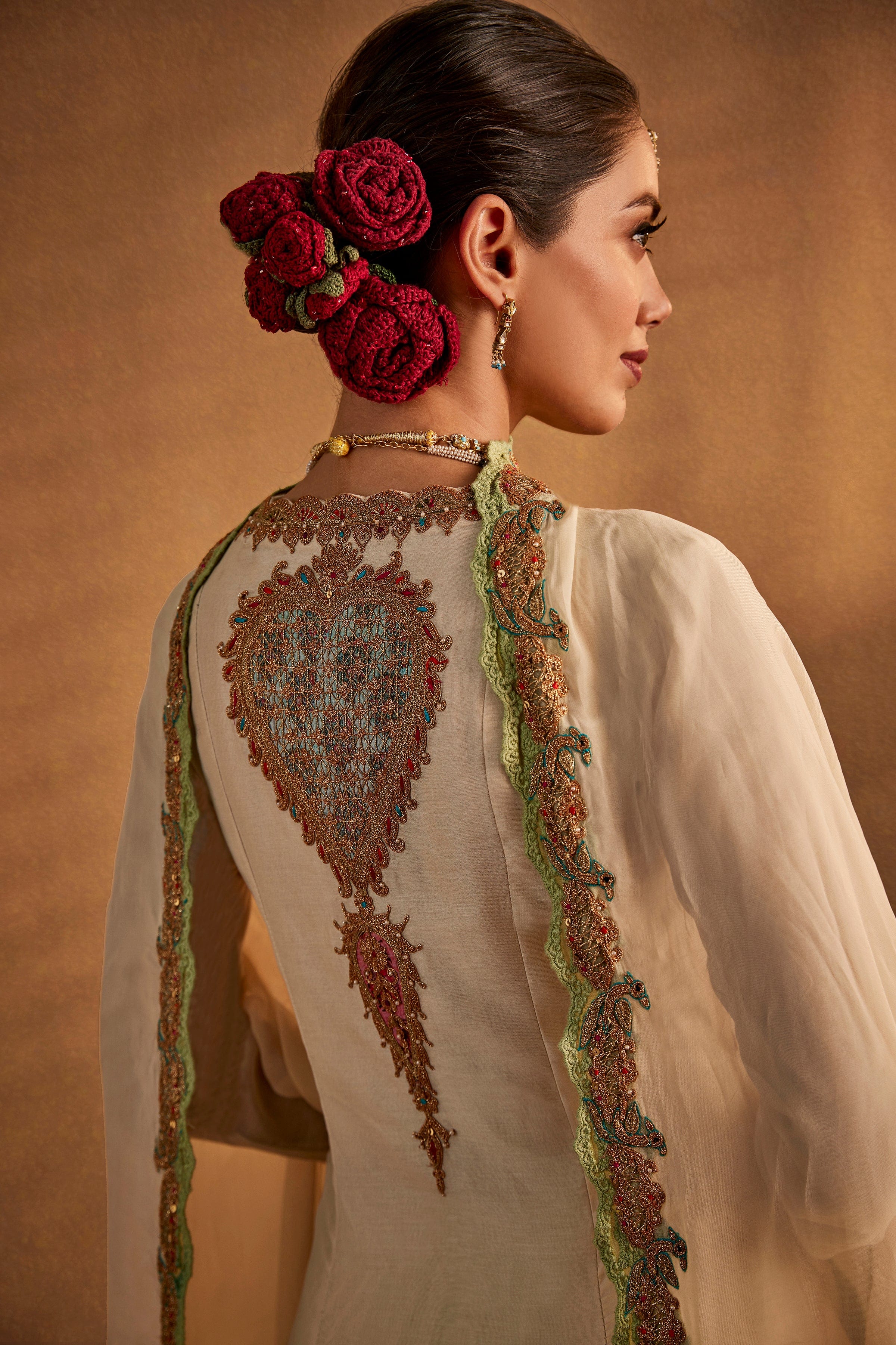 A soft ivory silk kurta paired with pants. The kurta features classic avian and sacred geometry motifs crafted with marodi ka kaam. The look is completed with a sheer organza dupatta.