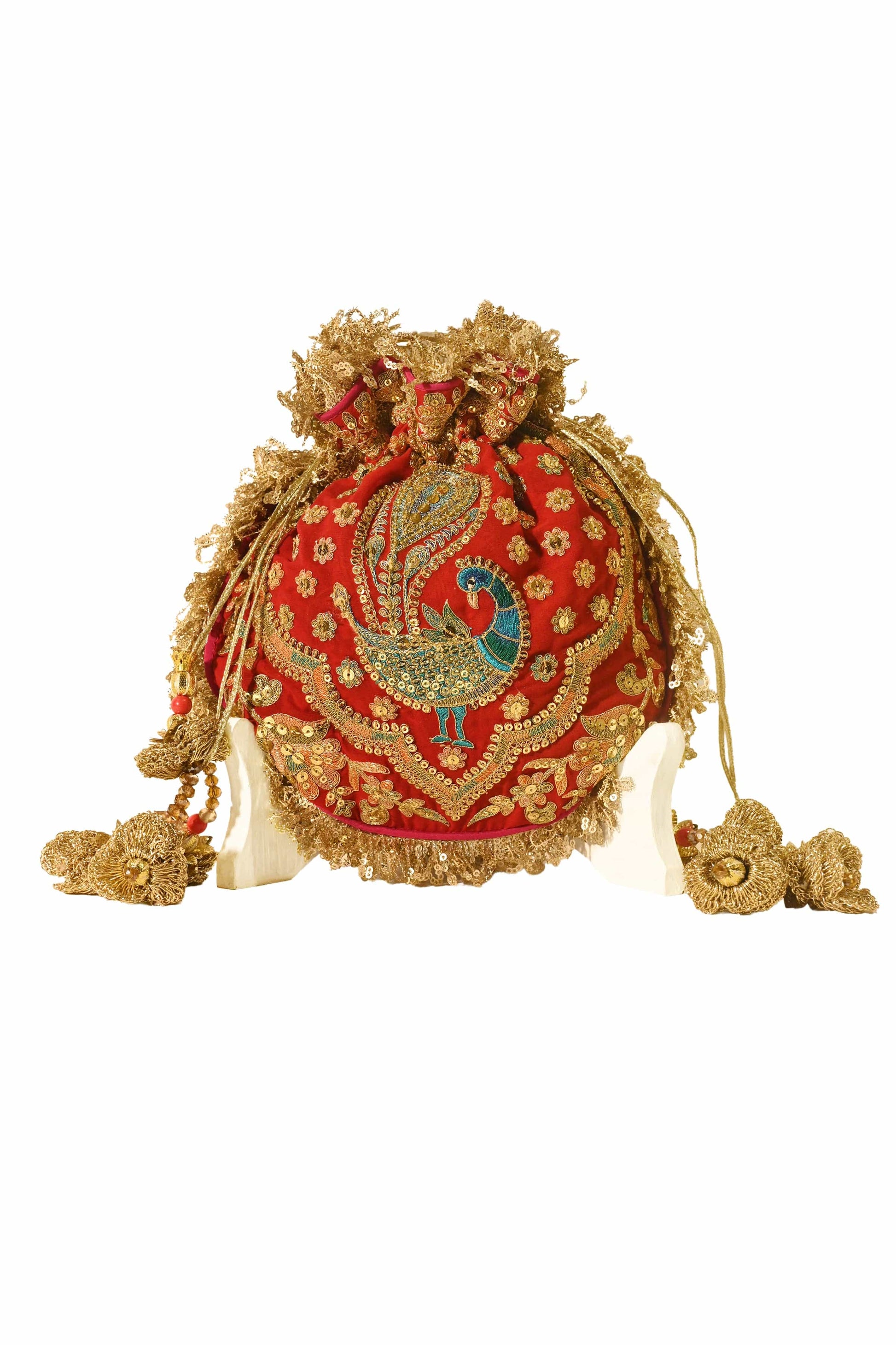 Surkh-e-Mor Potli is crafted on a red georgette base, embroidered in rich gold and silver tones. This potli features a fanned peacock motif. The embroideries are gleaned from Mughal era artefacts, inlay work and architectural details and the potli is edged with an old-world kiran and its drawstrings are finished with handmade crochet flower tassels.