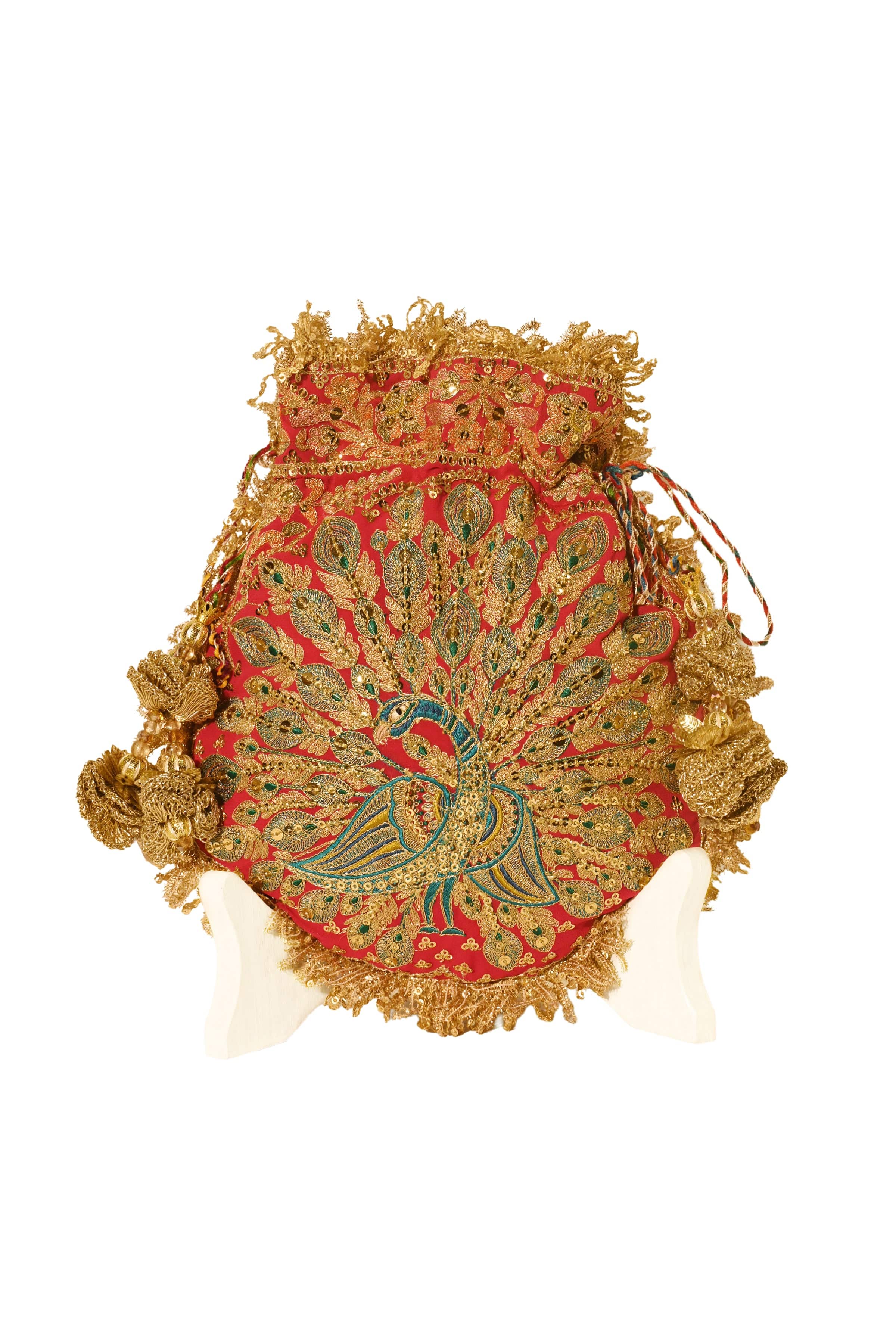 Gulnar Morzaar Potli is crafted on a soft magenta-red georgette base, embroidered in rich gold and silver tones. This potli features a fanned peacock motif. The embroideries are gleaned from Mughal era artefacts, inlay work and architectural details and the potli is edged with an old-world kiran and its drawstrings are finished with handmade crochet flower tassels.