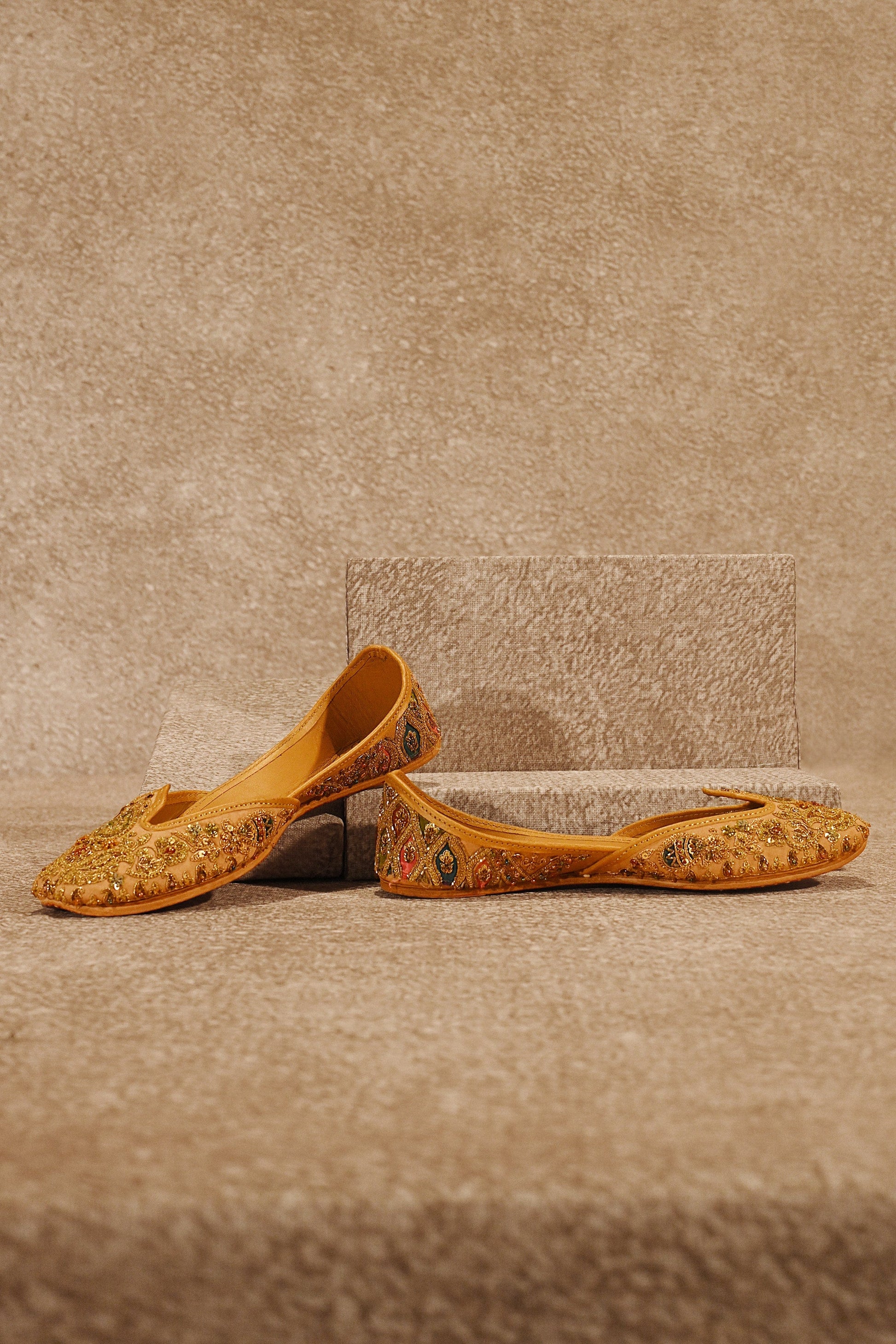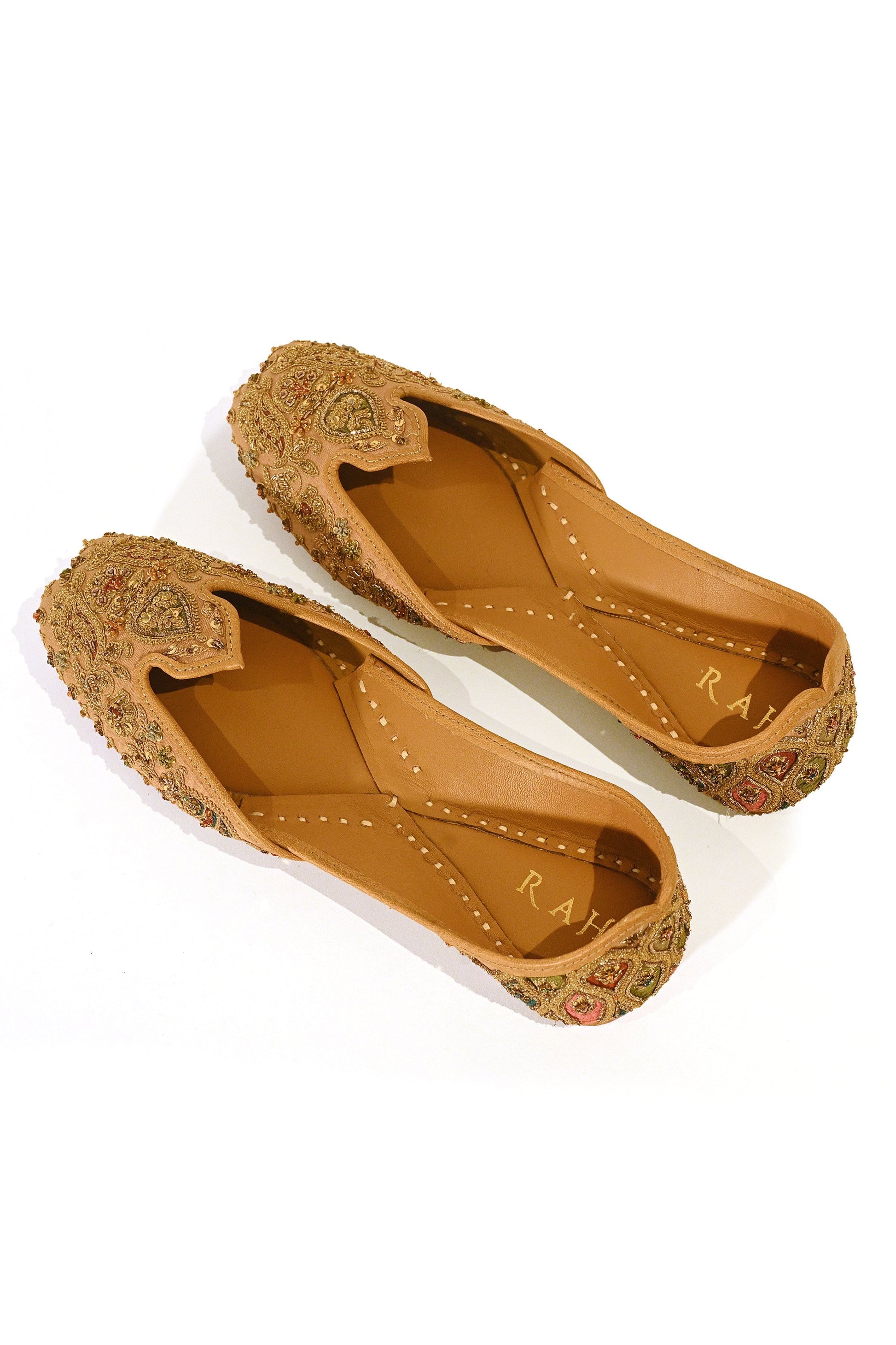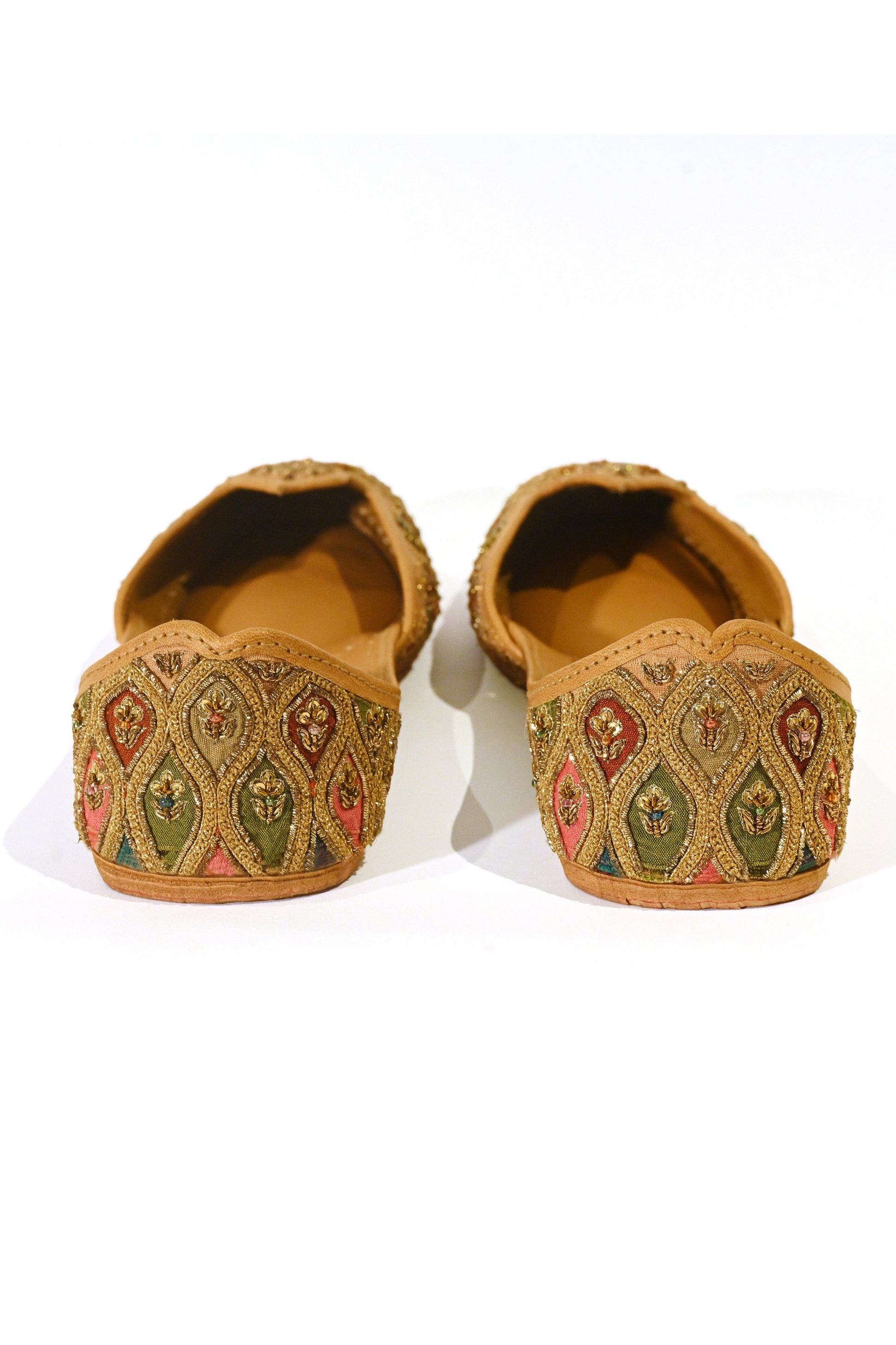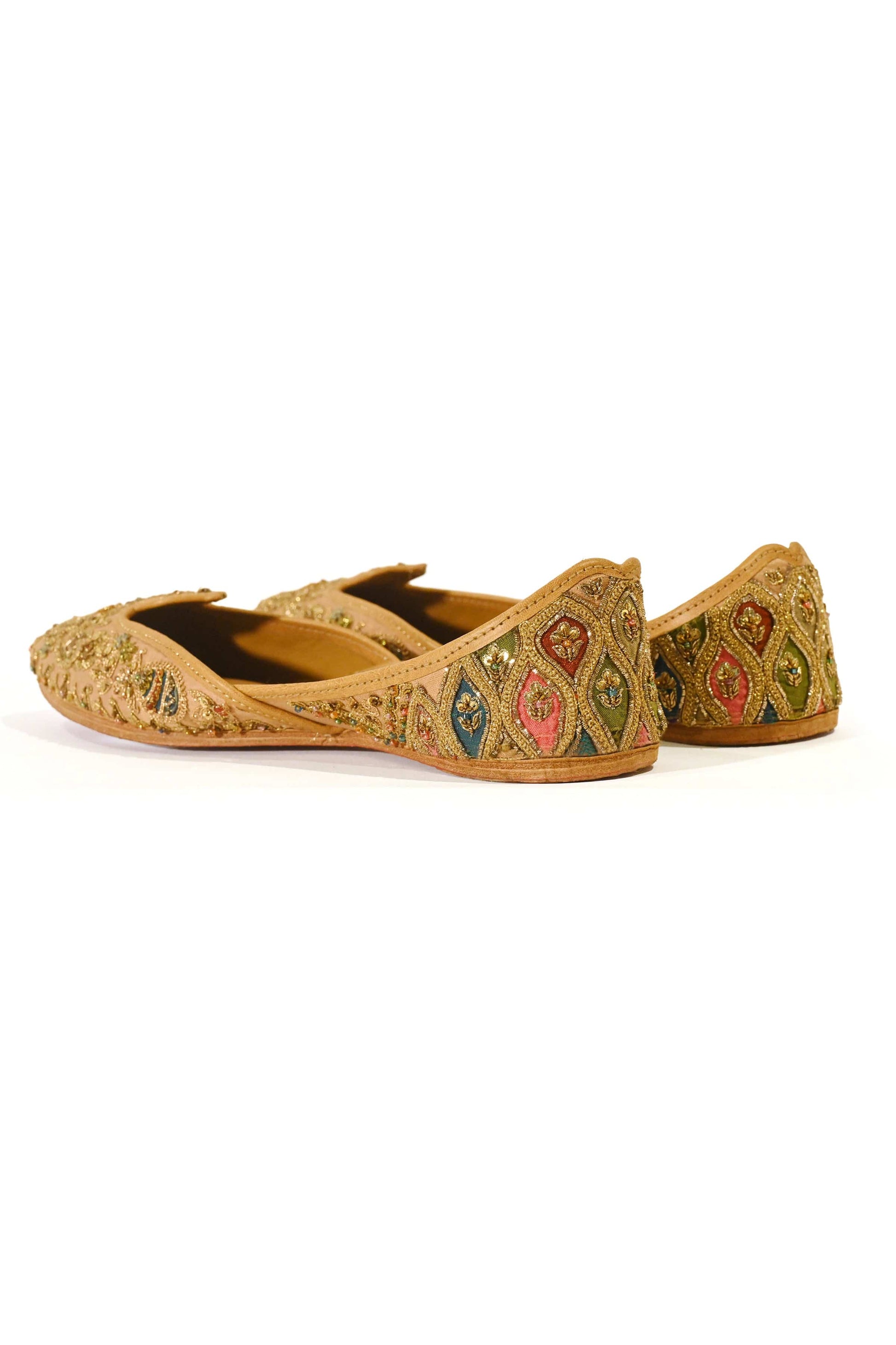 The jutti is constructed in a traditional silhouette defined by a petaled shape mehrab neckline derived from architectural arches, subtly contoured to support surface ornamentation. Its surface is worked in hand-executed antique gold zardozi, composed in dense floral and ornamental naqsh arranged with measured balance across the form. Set on a Champagne Blush ground with warm golden undertones, the embroidery maintains cohesion as it extends across the vamp and into the back. The closed-back heel is finished with multi-tonal textile patchwork, referencing atelier practices where surface contrast is resolved through handwork. Finished with traditional hand assembly and balanced structure for ceremonial wear.