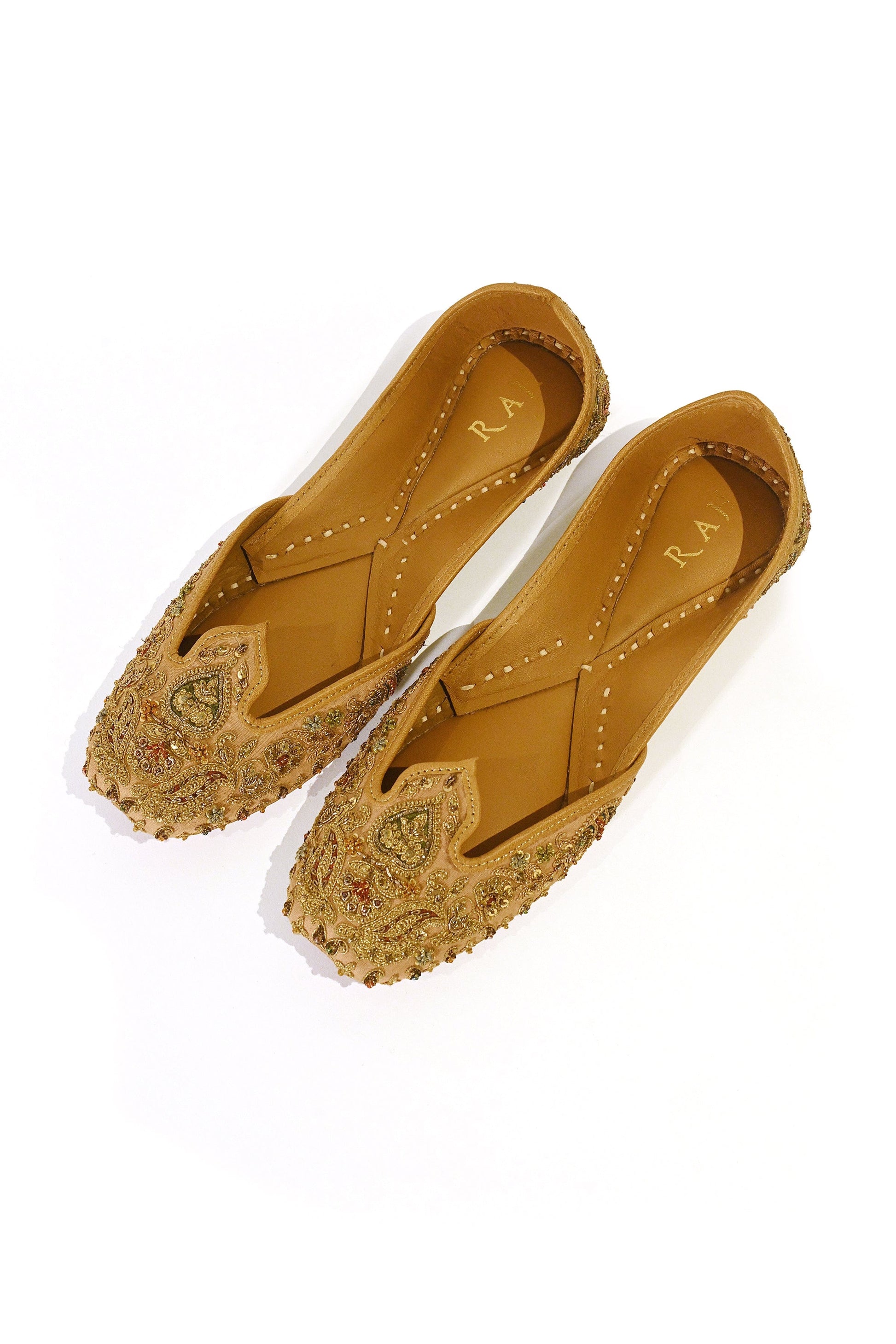 The jutti is constructed in a traditional silhouette defined by a petaled shape mehrab neckline derived from architectural arches, subtly contoured to support surface ornamentation. Its surface is worked in hand-executed antique gold zardozi, composed in dense floral and ornamental naqsh arranged with measured balance across the form. Set on a Champagne Blush ground with warm golden undertones, the embroidery maintains cohesion as it extends across the vamp and into the back. The closed-back heel is finished with multi-tonal textile patchwork, referencing atelier practices where surface contrast is resolved through handwork. Finished with traditional hand assembly and balanced structure for ceremonial wear. -