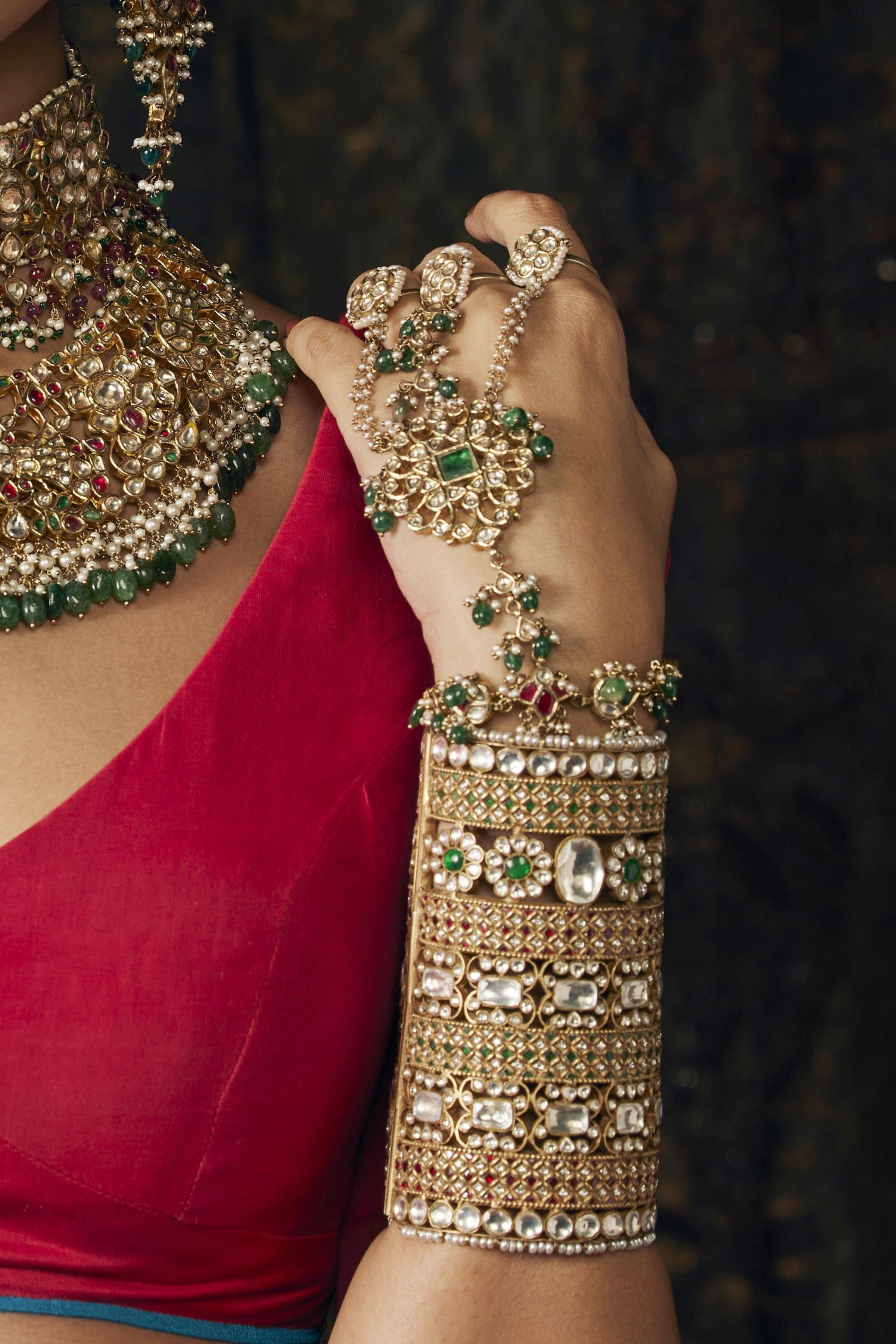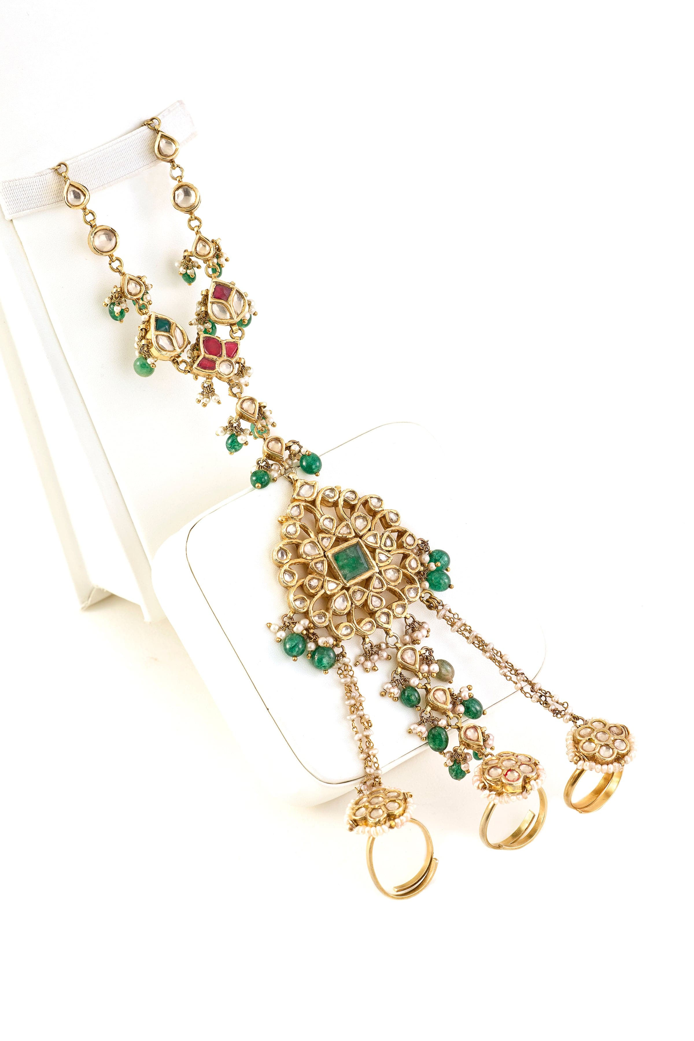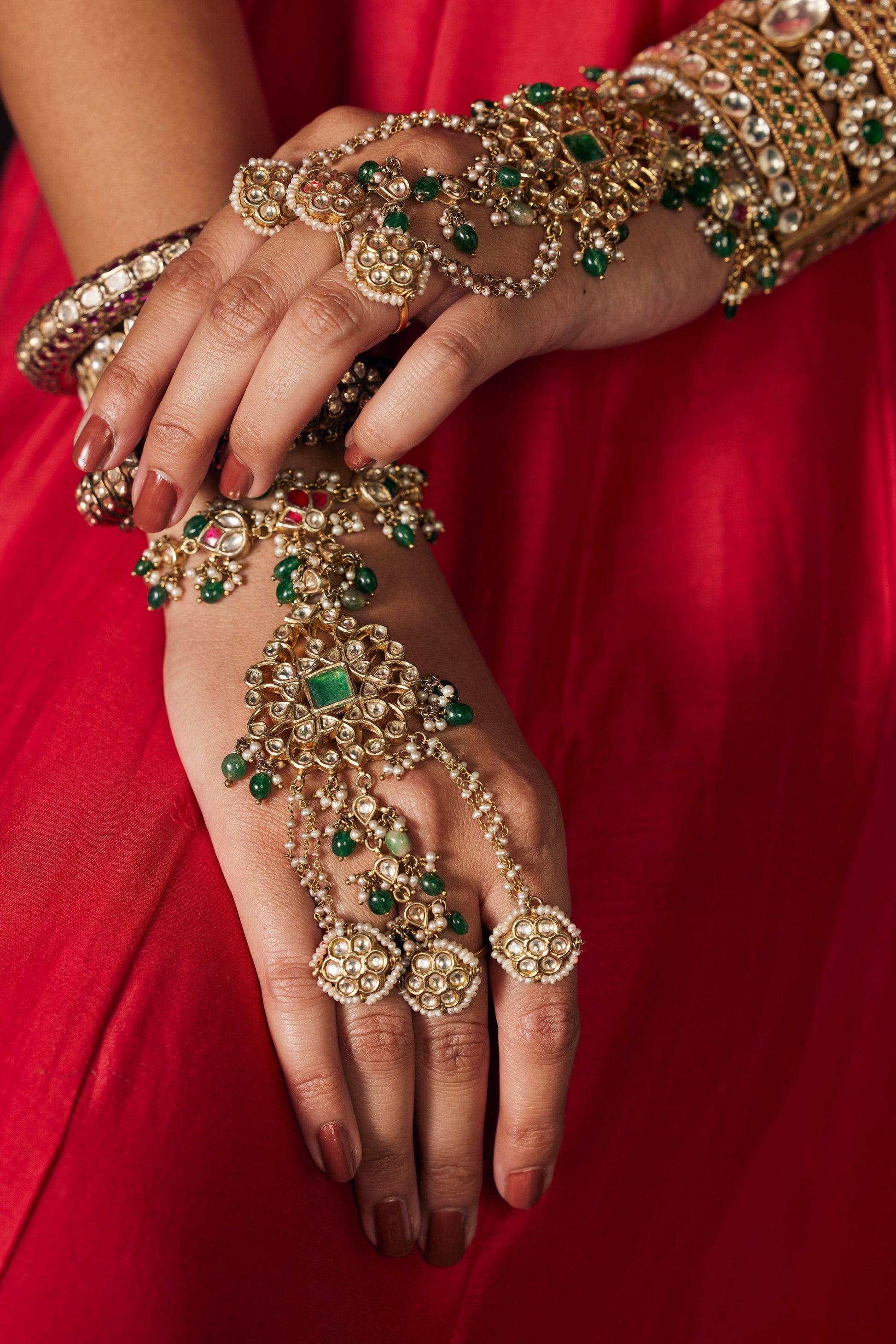 3 finger adjustable rings hath phool with rubies , emeralds and polki in gold infused 92.5 silver. Comes with a bracelet lock closure.