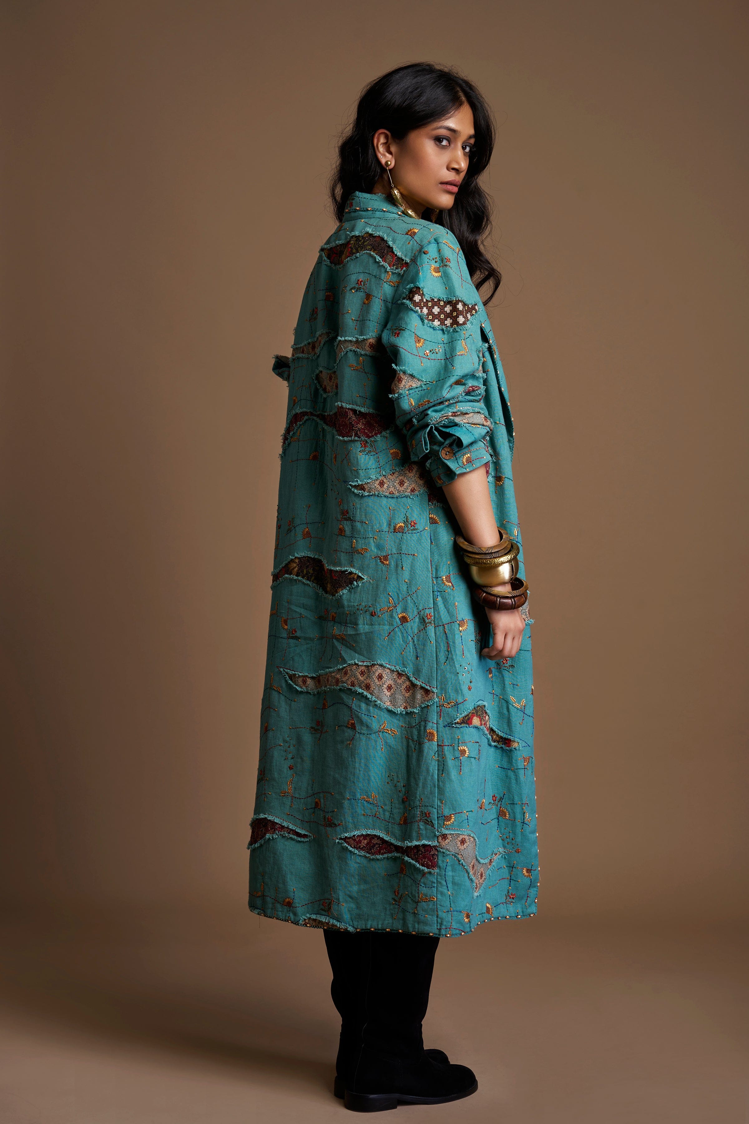 This trench ,a canvas of deep veridian and teal, whispers of ancient riverbeds and forgotten maps. Its surface embroidery is not thread but memory - a constellation of delicate, meandering stitches creating cracked earth motifs, punctuated by abstract, sunfaded blooms. This isn't mere decoration; its a texture of resilience, where patches of contrasting fabric are deliberately revealed, mended with visible, gold tipped dots, celebrating every tear and journey.