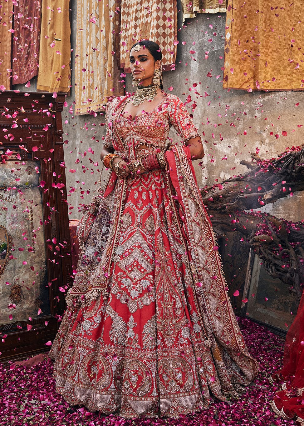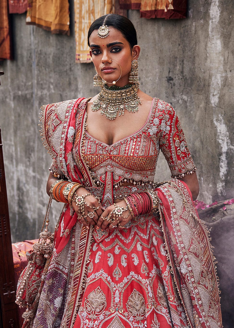 Watermelon Red Peacock LehengaThe 'Mirari' Collection is a captivating journey through time, drawing from the splendor of the 17th to 19th centuries. Inspired by Mughal architecture, Persian motifs, and Indian sacred geometry, each ensemble is a celebration of heritage. With vibrant hues and timeless silhouettes like Lehengas and Sarees, 'Mirari' offers treasures for every occasion. European influences delicately intertwine with South Asian sensibilities, while intricate handwork pays homage to bygone elegance. Experience the echoes of a glorious past, reimagined for the modern wearer, in the 'Mirari' Collection.