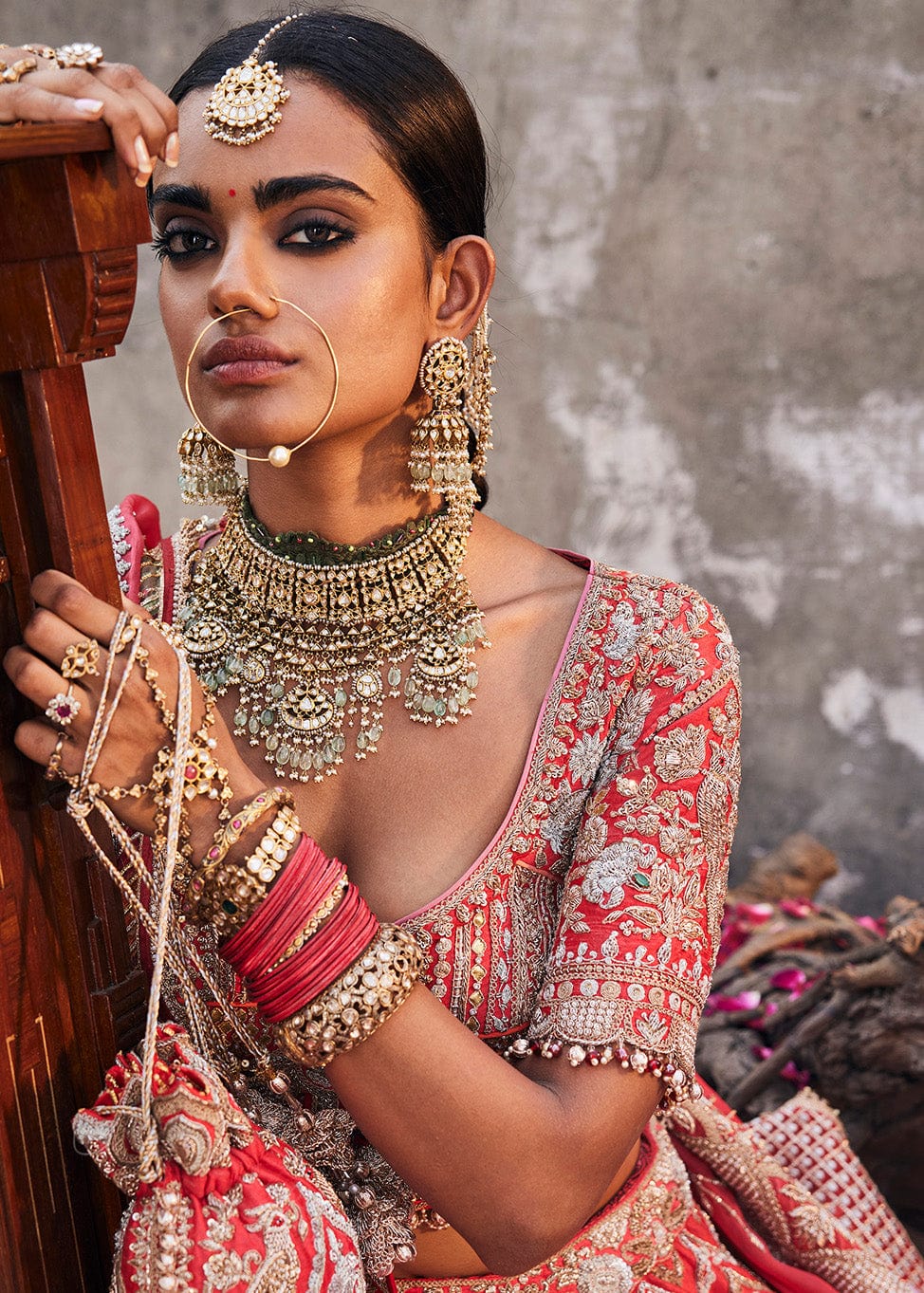 A watermelon sorbet hued lehenga. The handcrafted skirt features floral vines and majestic peacocks gleaned from archival Kashmiri shawls which are rendered with the traditional couching technique using twisted metal yarn doris, as well as zardozi, dabka, naqshi, sequins and pearls. It is paired with an illusion tie-up choli and an embroidered organza dupatta. The look is completed with a sweeping tulle veil.