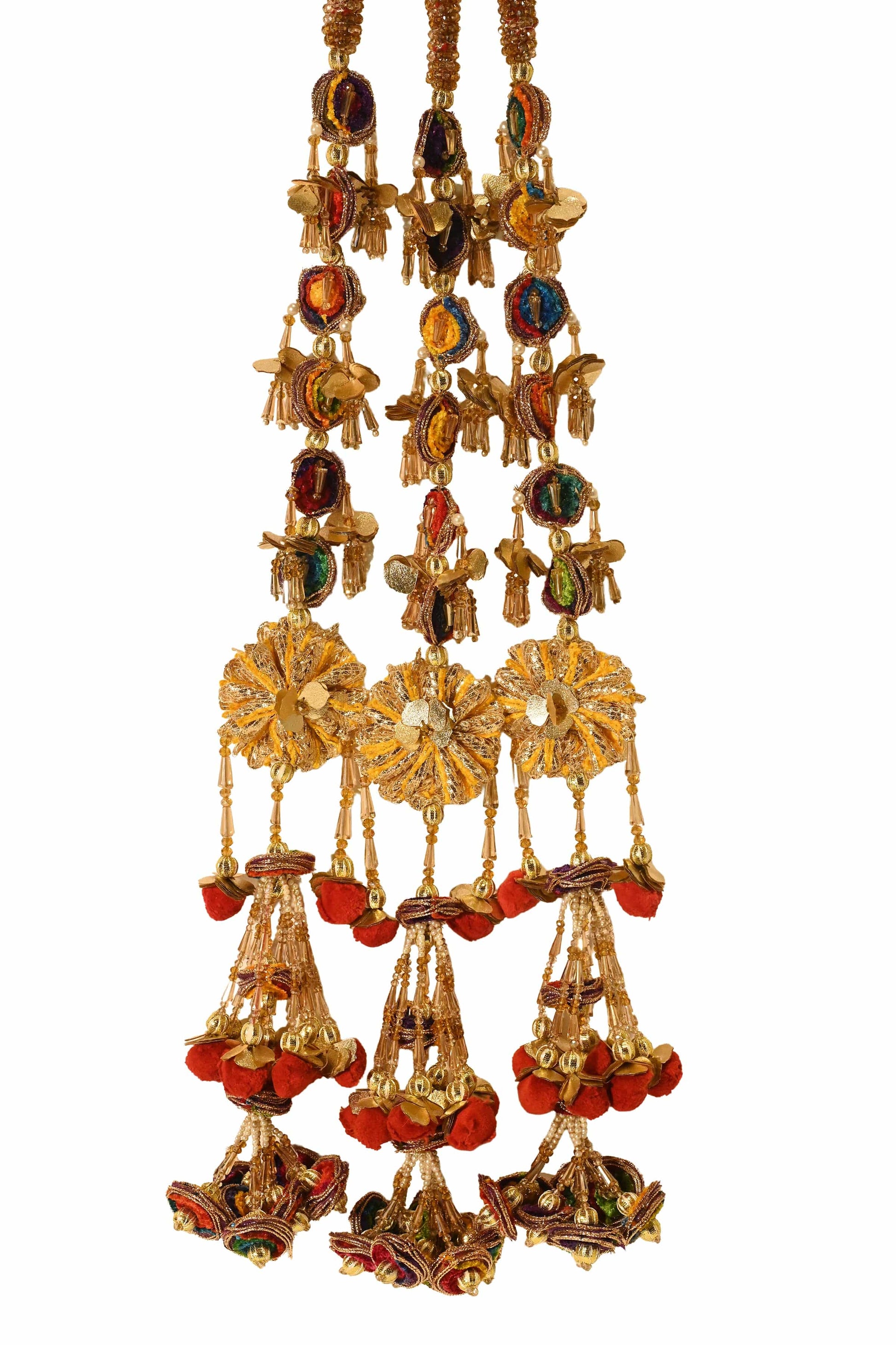 A gold-multicolour handcrafted parandi featuring layered floral elements, crystal and bead accents, and pearl detailing, finished with cascading tassels.
